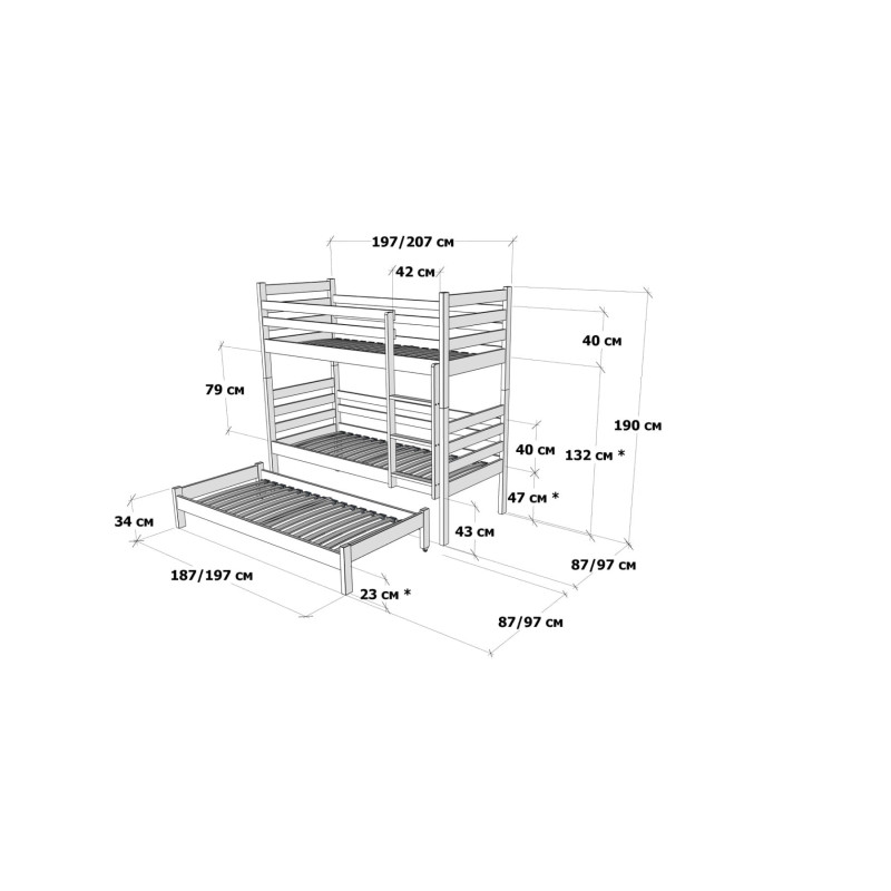 | Висота від підлоги до сп. місця: | 1 ярус - 23 см; 2 - 47 см; 3 - 132 см |