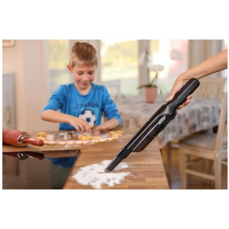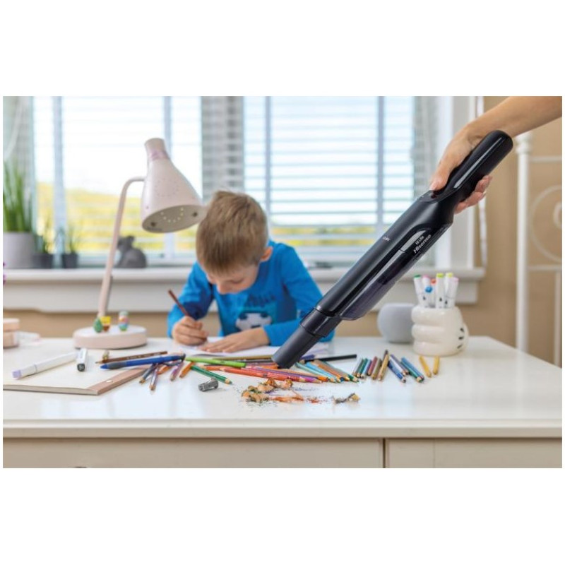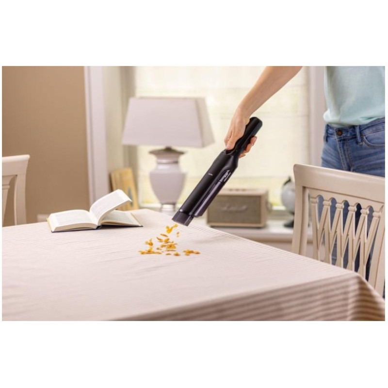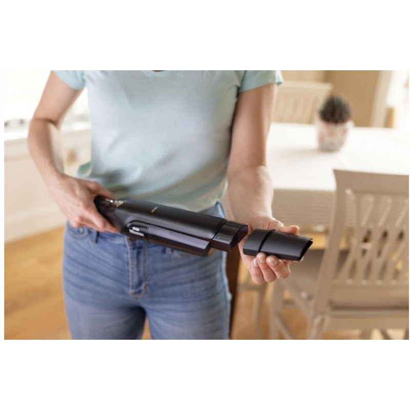 Цей ручний пилосос обладнаний знімним літій-іонним акумулятором на 10,8 В, який можна заряджати безпосередньо або на підставці пилососа. Повністю зарядженого акумулятора достатньо, щоб прибрати всі ваші кімнати. Завдяки бездротовій конструкції цей пилосос легший, портативний, а також має довший термін служби.