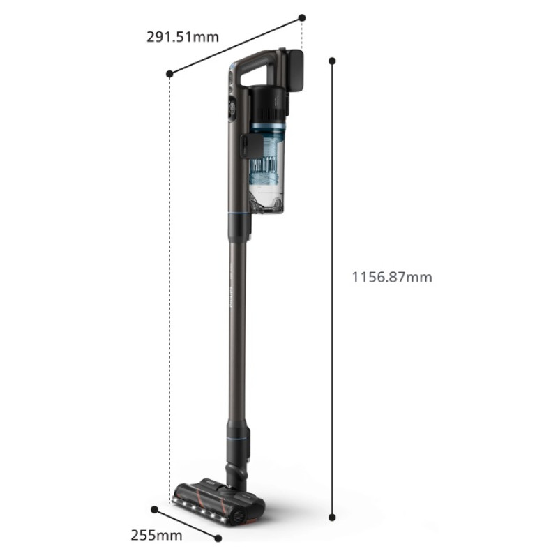 Упорайтеся з прибиранням за один раз! За один цикл заряджання пилососи Philips серії 7000 можуть прибрати понад 360 м2 в екорежимі та понад 135 м2 у турборежимі (7). Можна прибрати весь дім навіть у турборежимі. Можна придбати додаткові батареї та пристрій швидкої зарядки (XV1797), щоб збільшити площу прибирання вдвічі.