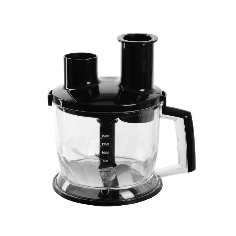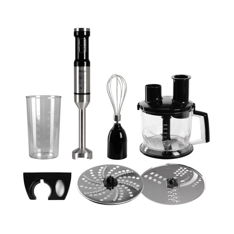Разом з блендером у комплекті йдуть ніж-подрібнювач, вінчик, мірна склянка об’ємом 0,6 л, а також велика чаша з кришкою об’ємом 1,5 л і декілька дисків до неї. Така комплектація дозволяє не лише змішувати, подрібнювати й збивати продукти, але й надзвичайно швидко та зручно шинкувати, натирати овочі й навіть робити деруни.