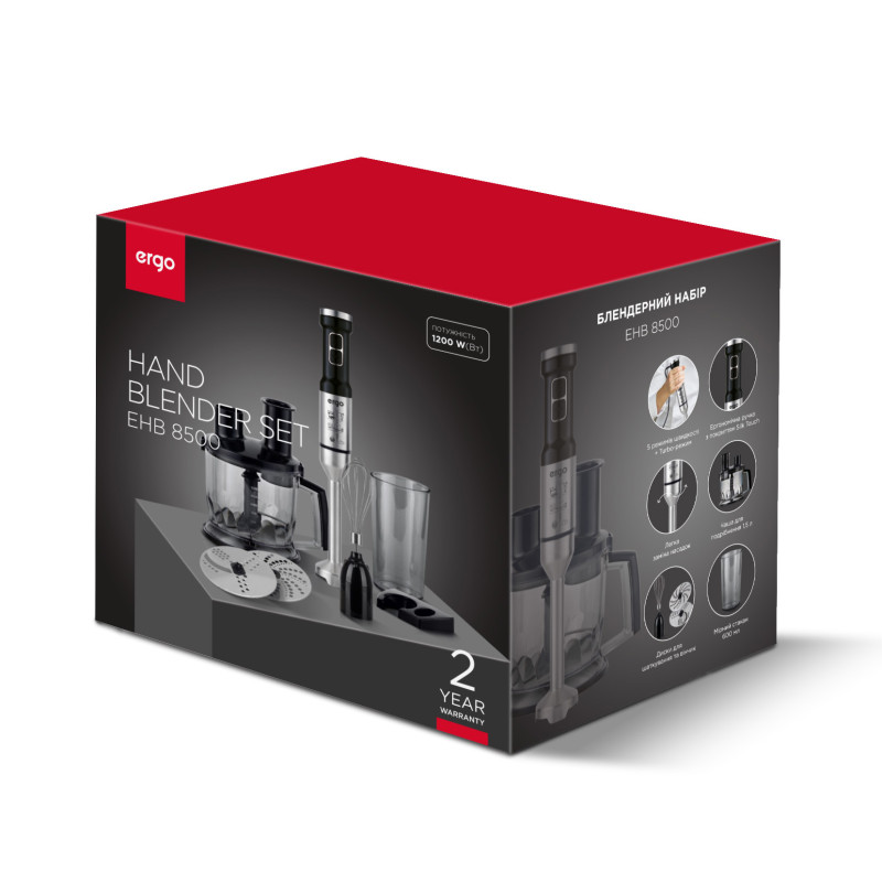 Занурювальний блендер ERGO EHB 8500 – відмінний спосіб максимально швидко та без зайвих зусиль вирішити такі рутинні задачі на кухні, як виготовлення пюре, мусів, збивання яєць, приготування коктейлів, подрібнення, шинкування та натирання овочів, фруктів тощо.