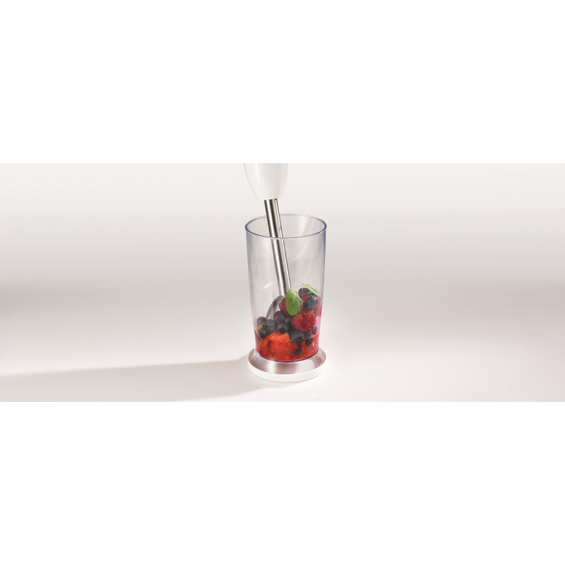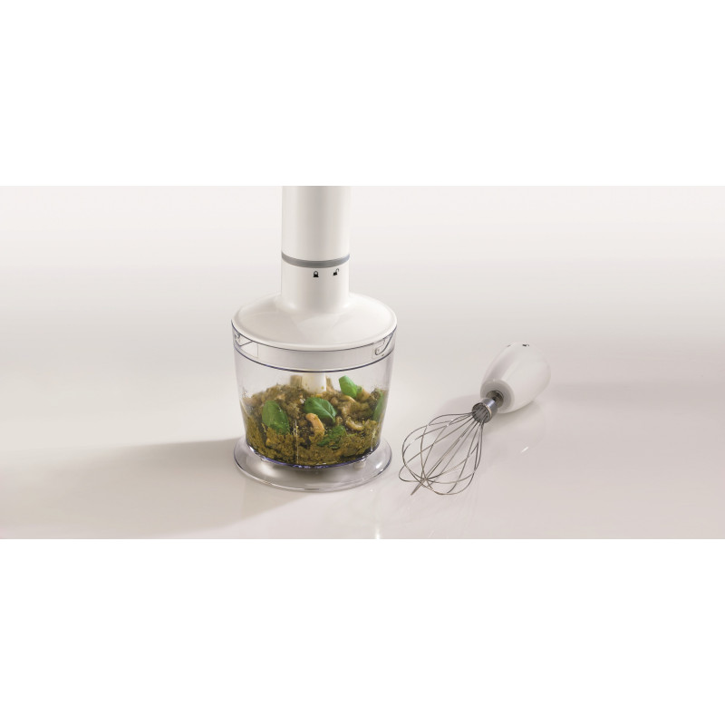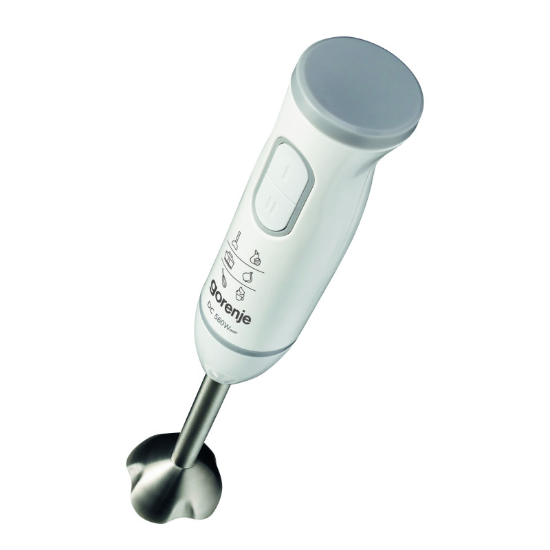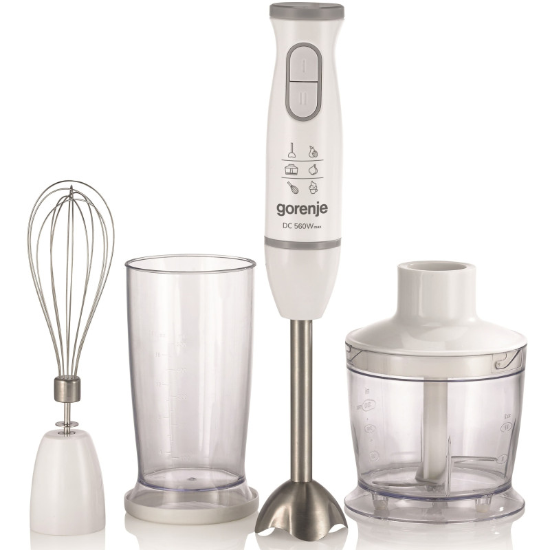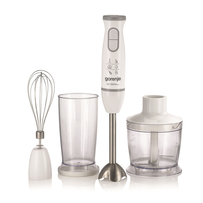 Gorenje HBC564QW — заглибний блендер потужністю 560 Вт із DC-двигуном, комплектом 4 в 1: металева блендерна ніжка, чаша 500 мл для змішування/збивання, вінчик та подрібнювач 500 мл. Має плавне регулювання швидкості, імпульсний режим, протипригарне покриття чаш, подвійний ніж подрібнювача та мірні позначки. Корпус поєднує пластик і метал, колір білий, довжина кабелю 1,2 м. Підходить для приготування пюре, супів, соусів, коктейлів, збивання кремів та подрібнення горіхів/трав. Компактний, легкий (1,2 кг), зручний для щоденного використання.