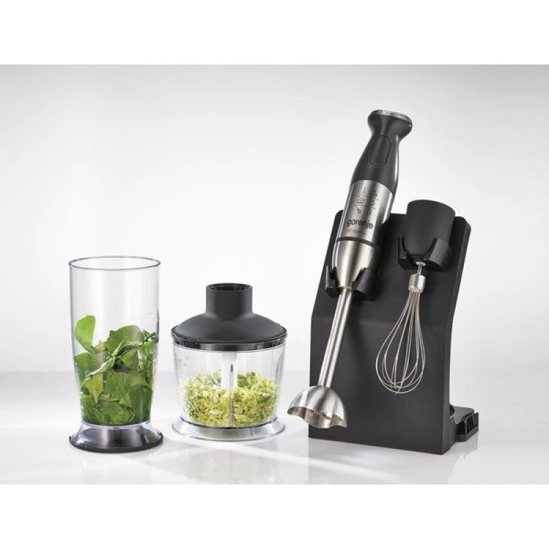 Блендер Gorenje HBC807QB/800 Вт виконий з металу та практичного пластику, а також відрізняється простотою кріплення насадки - вона прикручується до ручки. У комплекті йдуть ємності для подрібнення і збивання, а однією з кирисних функцій є імпульсний режим. Увімкнення відбувається натисканням кнопки. Блендер має плавне регулювання швидкості.