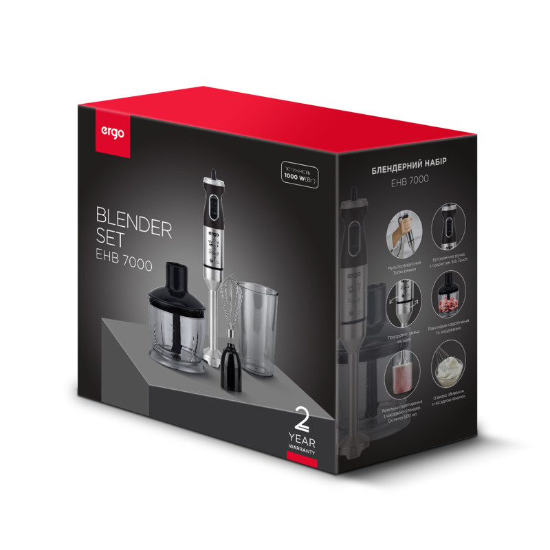 Завдяки занурювальній конструкції, блендер ERGO EHB 7000 – універсальний кухонний пристрій, який має широкий спектр функцій.