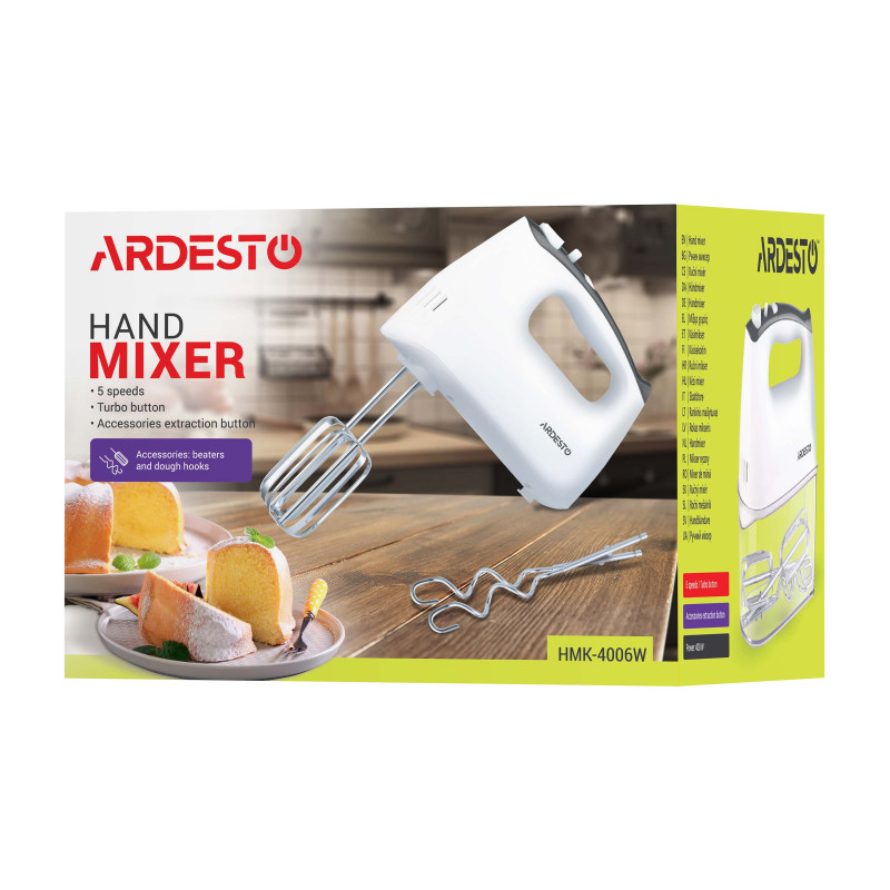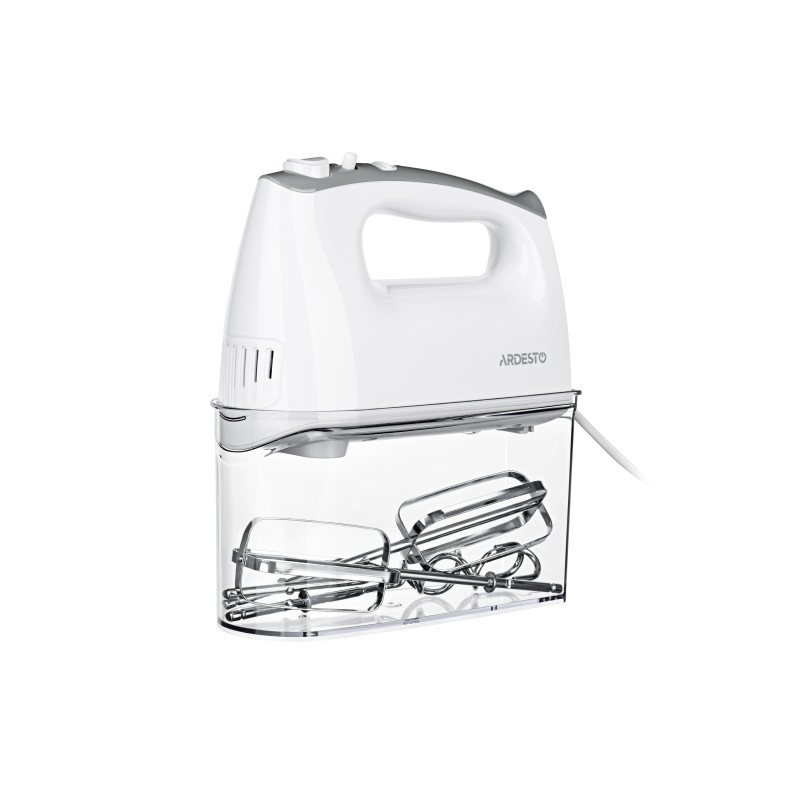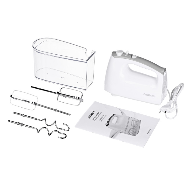 Ручний міксер для збивання інгредієнтів та швидкого замісу тіста. Для зручного зберігання насадок передбачено спеціальний контейнер.
