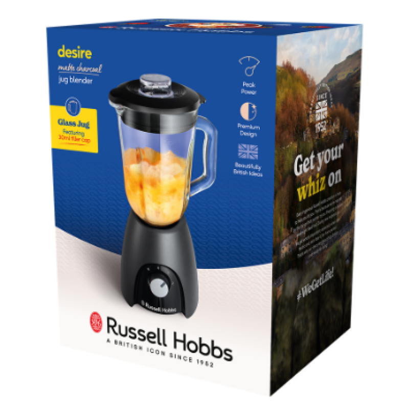 Якщо ви хочете завжди отримувати відмінні результати, блендер Russell Hobbs Desire Matte Charcoal Jug - це ваш ідеальний помічник для приготування смузі та соусів. Його 4-х точкові леза з нержавіючої сталі та потужність 650 Вт (850 Вт пікова потужність*) гарантують, що всі 1,5 л інгредієнтів будуть ідеально змішані в одну мить. Він не лише чудово працює, його міцна матова вугільна основа та компактний дизайн з чорними акцентами стильно виглядатимуть на вашій кухонній стільниці або легко прибиратимуться. Завдяки зручній знімній кришці для наповнення, а також 2 швидкостям та імпульсному налаштуванню, ваші супи, соуси та смузі вийдуть саме такими, якими ви їх любите. Коли ви закінчите, скляний глечик і кришку без вмісту бісфенолу можна мити в посудомийній машині або в раковині, і він буде готовий до наступного разу.