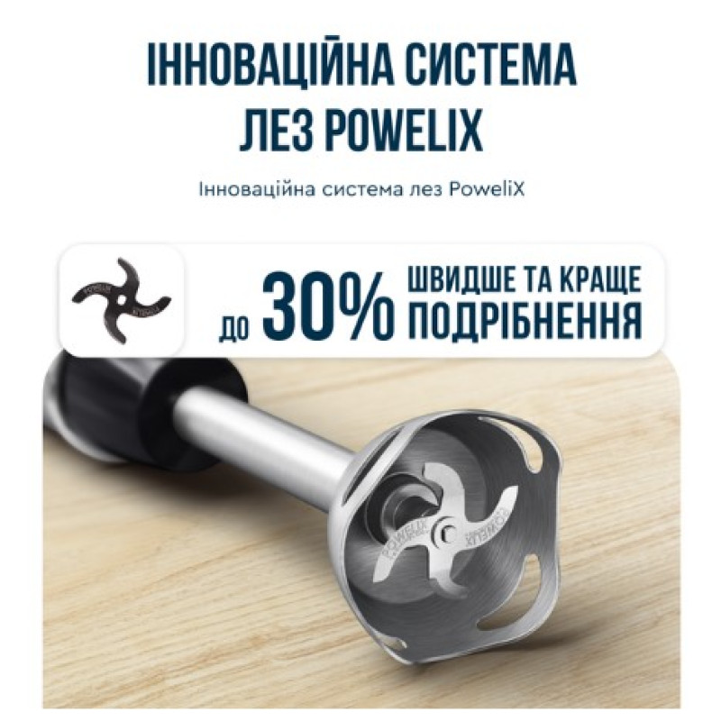 | Особливості | Фірмова технологія Powelix Blades Technology Оптимальна ефективність потужністю 1000 Вт Захист від бризок і нековзна ручка Знімні частини можна мити в посудомийній машині Знімна ніжка з високоміцного металу |