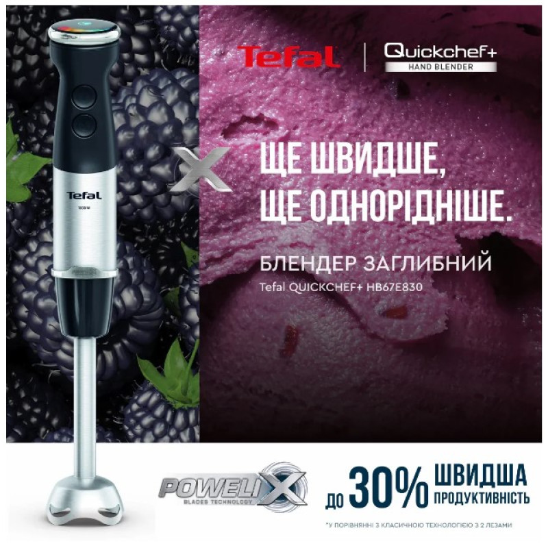 Оптимальна потужність без будь-яких зусиль із ручним блендером Quickchef+ HB67E830 від Tefal! Завдяки ексклюзивній технології лез Powelix і мотору потужністю 1000 Вт продукти змішуються на 30%* швидше, а навіть найтвердіші інгредієнти подрібнюються краще.