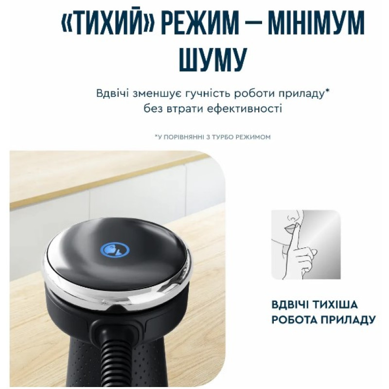 Функція Тихий режим знижує рівень шуму під час змішування. Це спеціальне налаштування дає змогу блендеру працювати у 2 рази тихіше.**