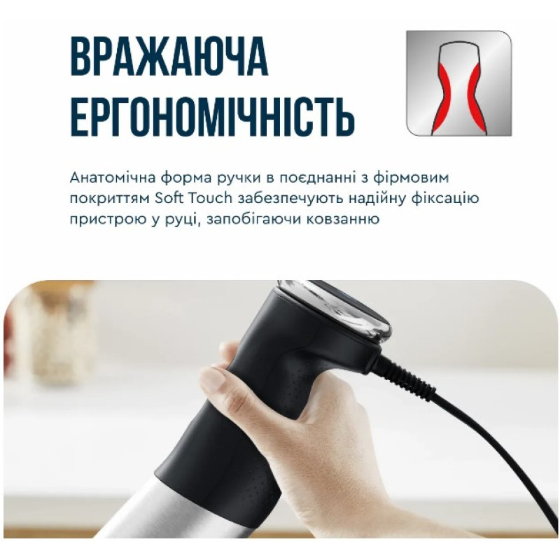 Сучасні зручні форми, ергономічна ручка з фірмовим покриттям Soft Touch, міцний корпус і захист від бризок.