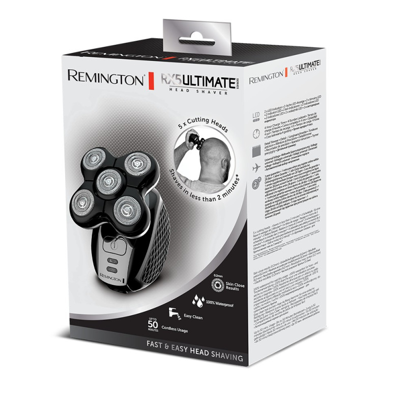 Електрична роторна бритва для голови Remington Ultimate Series RX5 призначена для швидкого та рівномірного гоління всієї поверхні голови. П’ять ріжучих головок забезпечують широке покриття та дозволяють виконувати гоління за лічені хвилини. Бритва адаптується до контурів голови та забезпечує стрижку до 0,2 мм. Підтримується сухе та вологе гоління з простим очищенням під водою.