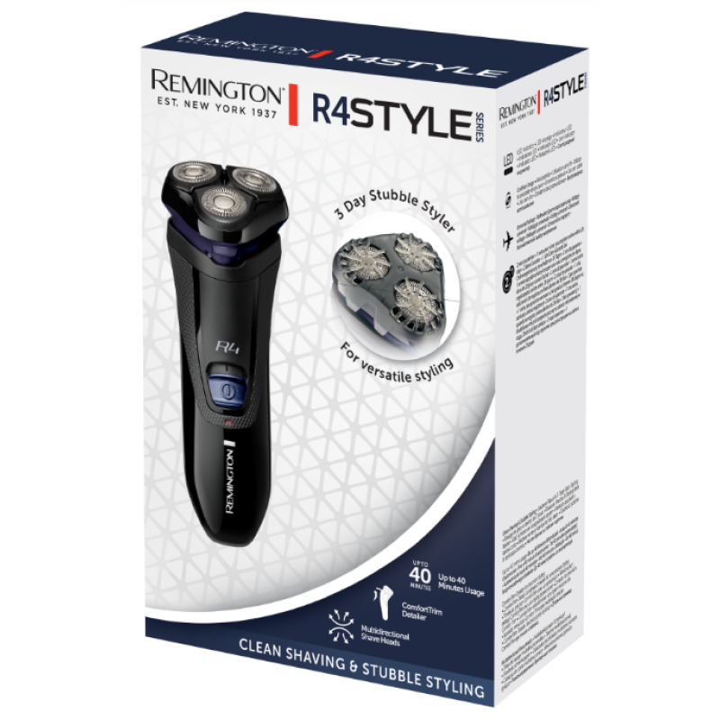 Насолоджуйтесь комфортним голінням і повсякденним стилем без зусиль із ротаційною бритвою Remington R4002 Style Series. Леза Dual Track забезпечують надійну роботу, а гнучка шия повторює контури вашого обличчя, захоплюючи незграбні волоски навіть у важкодоступних місцях. Якщо вам подобається відчуття свіжості обличчя після чистого гоління, ви можете насолоджуватися до 40 хвилин безперервної роботи після повного заряджання. Для укладання волосся на обличчі висувний тример допоможе вам сформувати вуса або бакенбарди, а 3-денний стайлер для щетини допоможе вам тримати під контролем 3-денний вигляд щетини, який вам подобається.