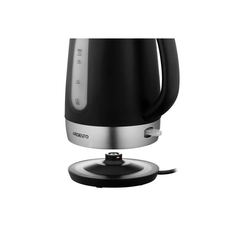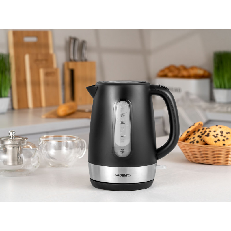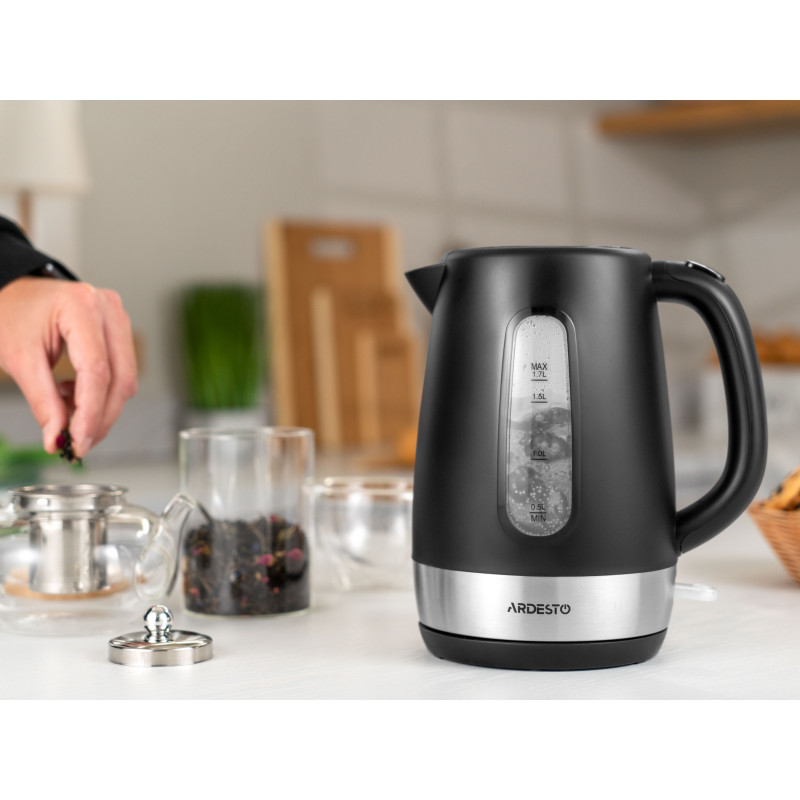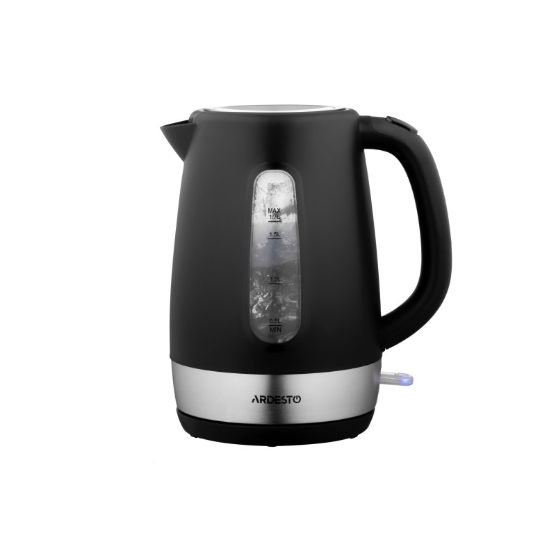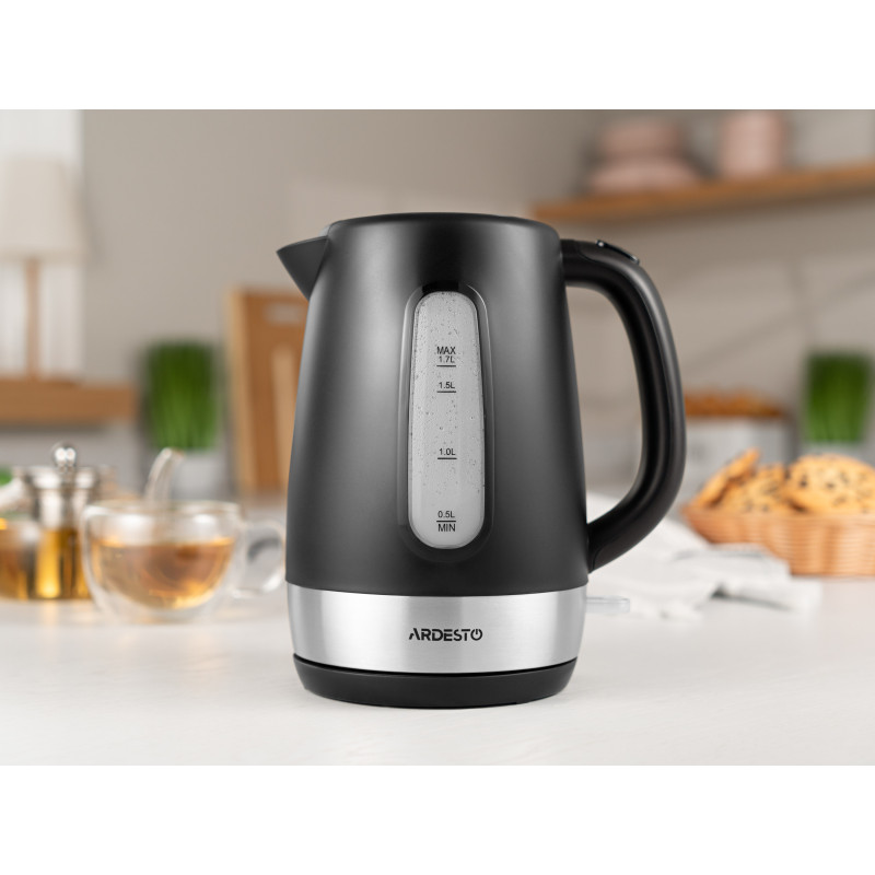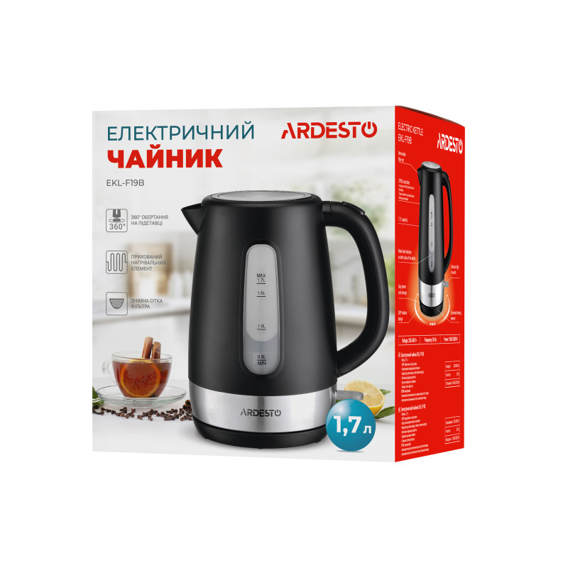 Електричний чайник ARDESTO EKL-F19B чорного кольору. Корпус із пластику з елементами з нержавіючої сталі, ергономічна ручка – з полікарбонату. Пристрій оснащено сертифікованим strix-контролером. Передбачено функцію вимикання в разі відсутності води та після її закипання. Потужність становить 2 150Вт, а об’єм – 1,7 л. Зручна підставка обертається на 360°. Оснащено вінтажним індикатором температури. Прихований нагрівальний елемент.
