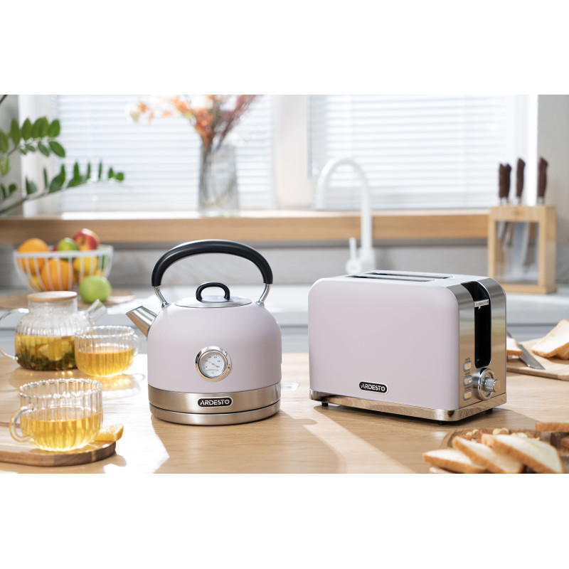 Виконаний у стильному дизайні та оснащений вінтажним термометром, електричний чайник EKL-F500L має потужність 1 800–2 150 Вт. Об’єм моделі становить 1,7 л, тож вдасться напоїти ароматним чаєм велику родину або компанію друзів.