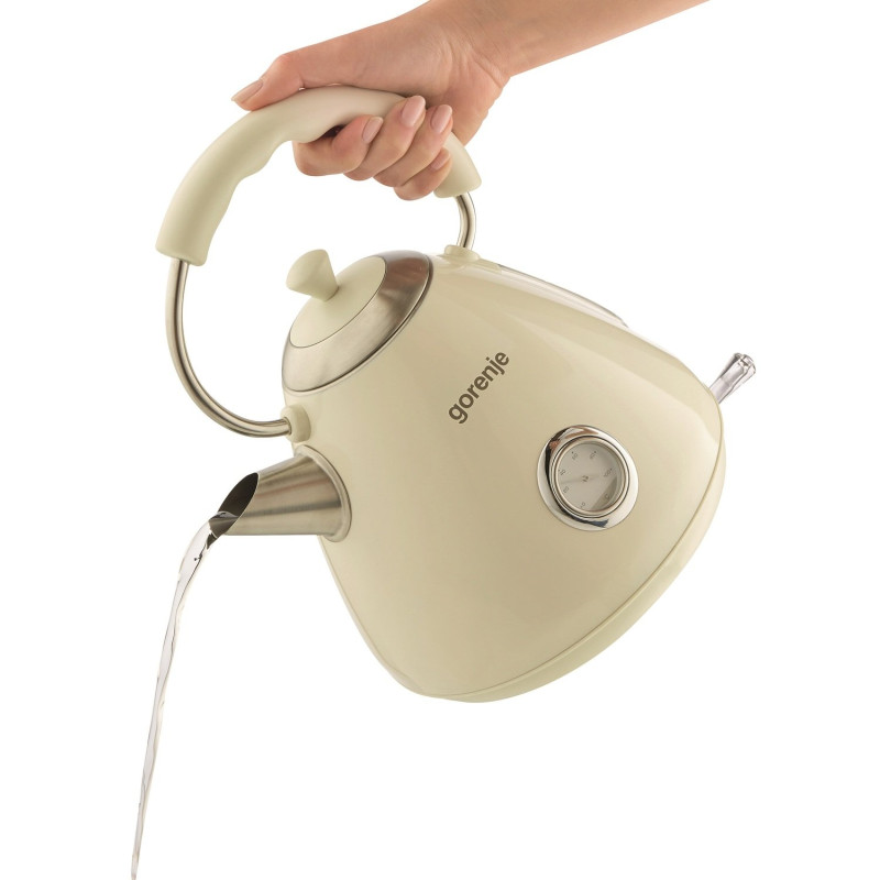 Чайник Gorenje K17CLI з колекції Classico виконаний в чорному кольорі. Незвичайний круглий індикатор температури розташований на корпусі. Автоматичне відключення при закипанні або при відсутності води забезпечує безпеку експлуатації. Фільтр можна зняти, щоб вимити. Прилад обертається на 360 градусів щодо центру підставки, тому його можна ставити з будь-якого боку.