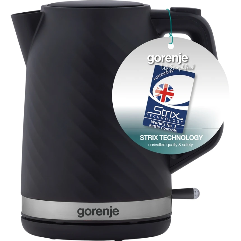 Стильний електрочайник Gorenje K17SPB на 1.7 л з контролером Strix та матовим чорним покриттям — надійний і безпечний вибір для щоденного використання.