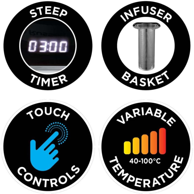 | Особливості | Підтримка заданої температури (термос), Поворот на підставці на 360°, Комплетується заварником із нержавіючої сталі для заварювання різних видів чаю, Знімний фільтр від накипу, Без світлового індикатора, З дисплеєм, З фільтром від накипу, З таймером увімк |