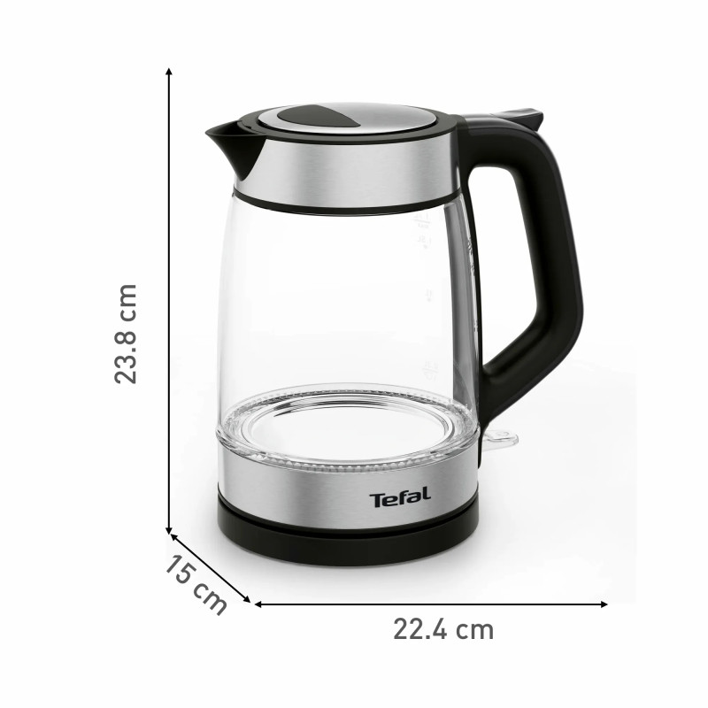 Електрочайник Tefal Glass Kettle KI605830 об'ємом 1,7 літра виготовлений із прозорого скла, що дозволяє контролювати рівень води. Оснащений прихованим нагрівальним елементом потужністю 2200 Вт для швидкого кип'ятіння. Має зручний носик для наливання без розбризкування та внутрішнє підсвічування під час роботи.