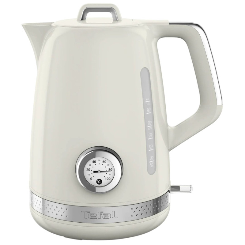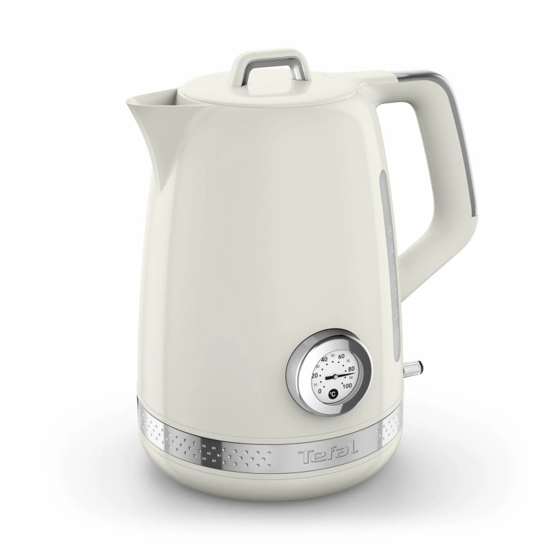 Електрочайник Tefal Soleil+ поєднує сучасну функціональність із ретро-дизайном у бежевому кольорі. Об’єм 1.7 л дозволяє кип’ятити воду для кількох чашок напоїв за один цикл. Модель оснащена вбудованим термометром для контролю температури води та надійним термостатом Strix для безпечної роботи. Відкидна кришка й індикатор рівня води спрощують наповнення та контроль об’єму. Знімний фільтр від накипу допомагає підтримувати чистоту води під час щоденного використання.