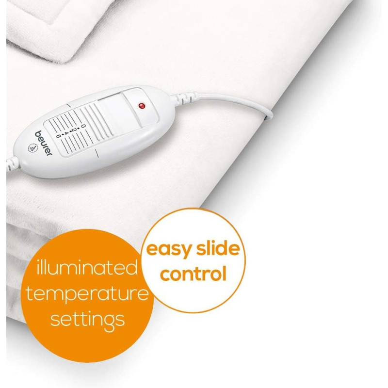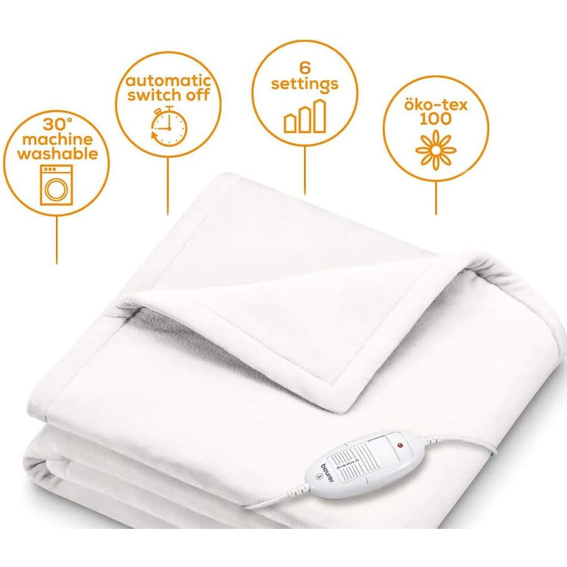 М'яка електроковдра з флісу. Дарує індивідуальне тепло і затишок за будь-якоъ погоди, На вибір шість температурних режимів для максимально комфортного використання. Споживає мало електроенергії, гарантує безпечне використання з системою BSS. Автоматичне вимкнення приблизно через 3 години. Запатентована система електронного регулювання температури. Інформаційний дисплей з підсвічуванням.Система безпеки Beurer (BSS). Можна прати в машині при 30 °C.