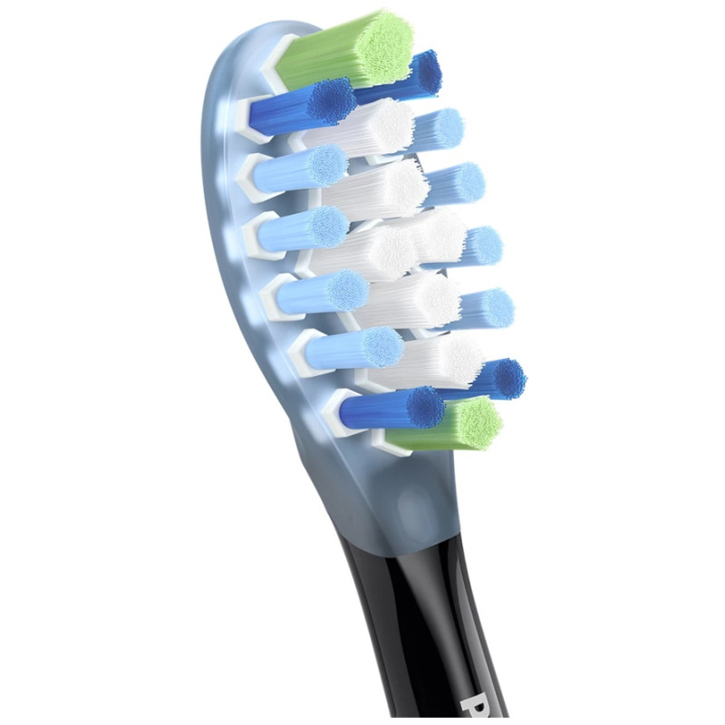 Для глибокого очищення насадка має густі, жорсткі щетинки у центрі, які розташовані у формі п'ятикутника. Вони відбілюють і полірують ваші зуби, забезпечуючи до 100% більше видалення плям лише за три дні.***
