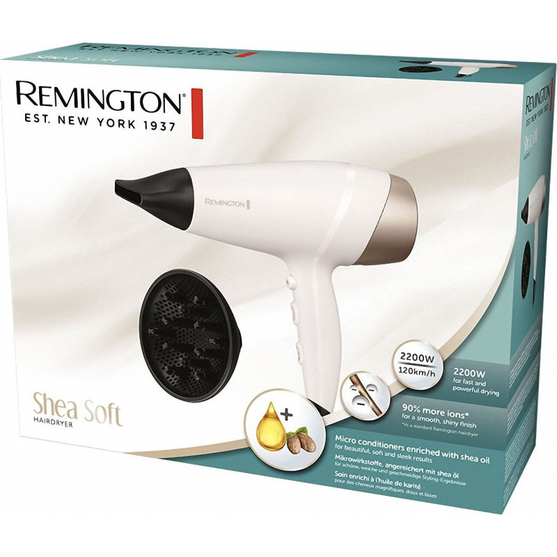 Незалежно від типу вашого волосся, ви можете досягти природної м’якості за допомогою фена Shea Soft, а його мікрокондиціонери, збагачені розкішною олією ши, щоразу забезпечують гладкі результати. Чудове волосся починається з красивого гладкого вигляду та природної м’якості. М’який фен Remington Shea Soft містить мікрокондиціонери, збагачені олією ши, які потрапляють у потік повітря, щоб зробити волосся неймовірно м’яким і гладким. Іонна технологія зменшує статику, щоб усунути завивання для покриття без розльоту.
