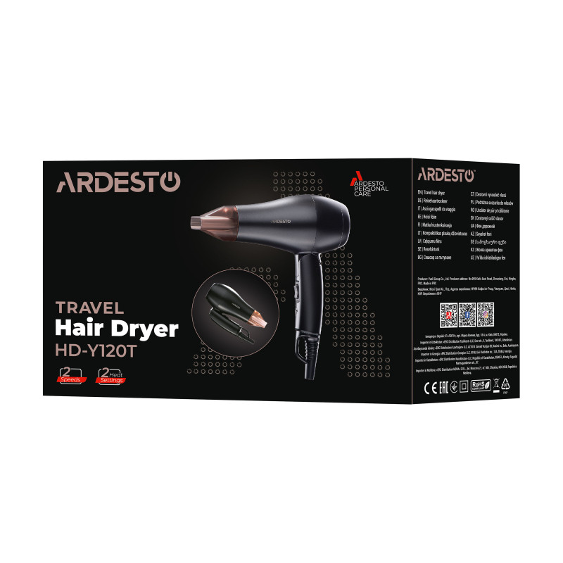 Фен ARDESTO HD-Y120T, дорожній, 1200Вт, складна ручка, 2 швидкості, 2 темп. режими, чорний