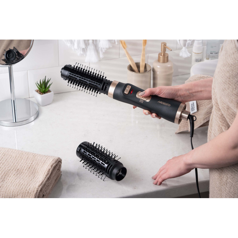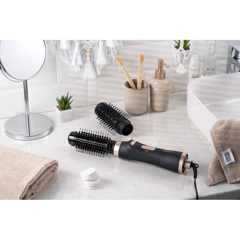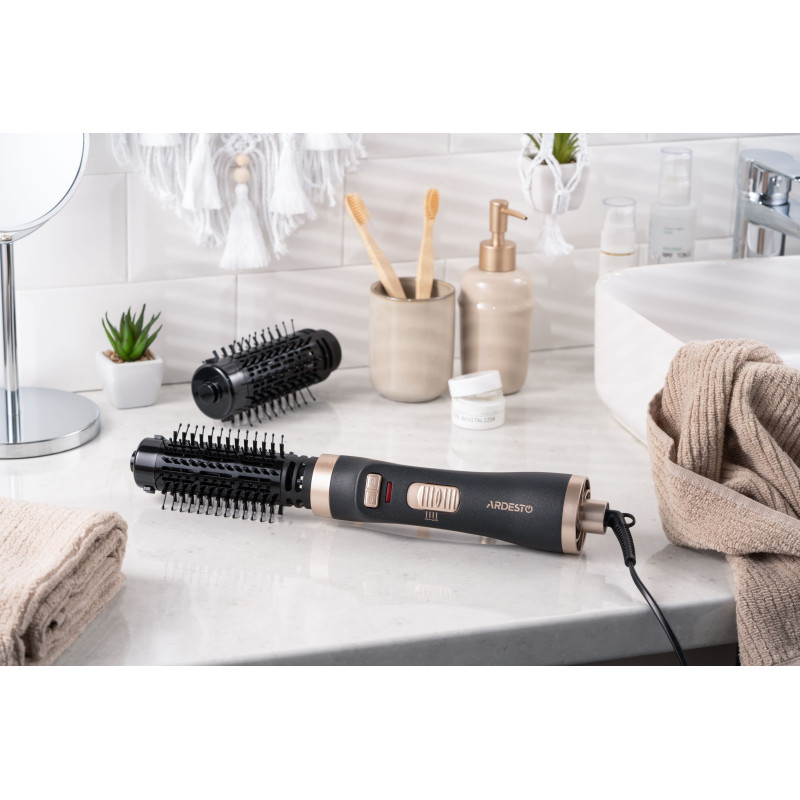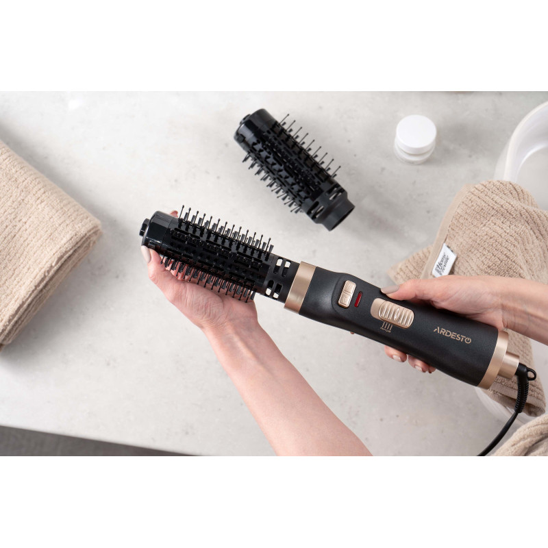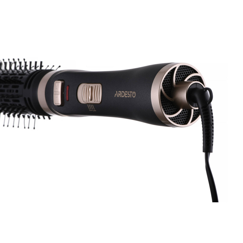 Фен-щітка ARDESTO – стайлер для укладання локонів, який одночасно сушить волосся, потужністю 1 000 Вт. Пристрій має два температурні режими. У комплектації передбачено дві знімні насадки з керамічним покриттям діаметром 40 і 50 мм, які обертаються за та проти часової стрілки. Додає зручності під час користування шнур живлення з обертанням на 360°. Аби стати власницею красивої укладки, не обов’язково відвідувати салон. Із феном-щіткою ARDESTO HD-C100 можна з легкістю робити зачіску самостійно.
