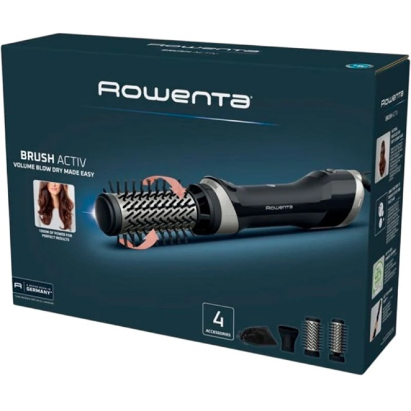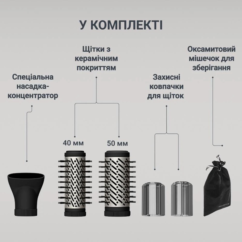 | Комплектація | Фен-щітка; 2 щітки (50 мм і 40 мм); Насадка для попереднього сушіння; Захисні ковпачки для щіток; Мішок; Інструкція; Гарантійний талон; |