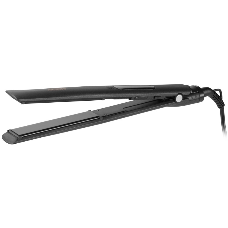 Плойка чорного кольору з керамічним покриттям та електронним керуванням для випрямлення волосся та створення локонів.