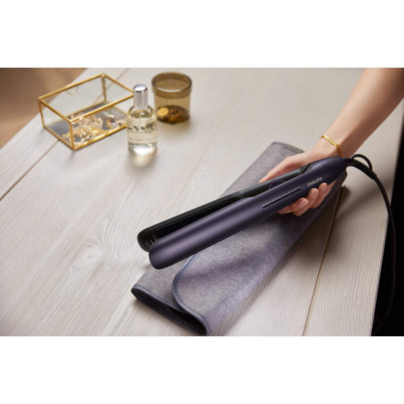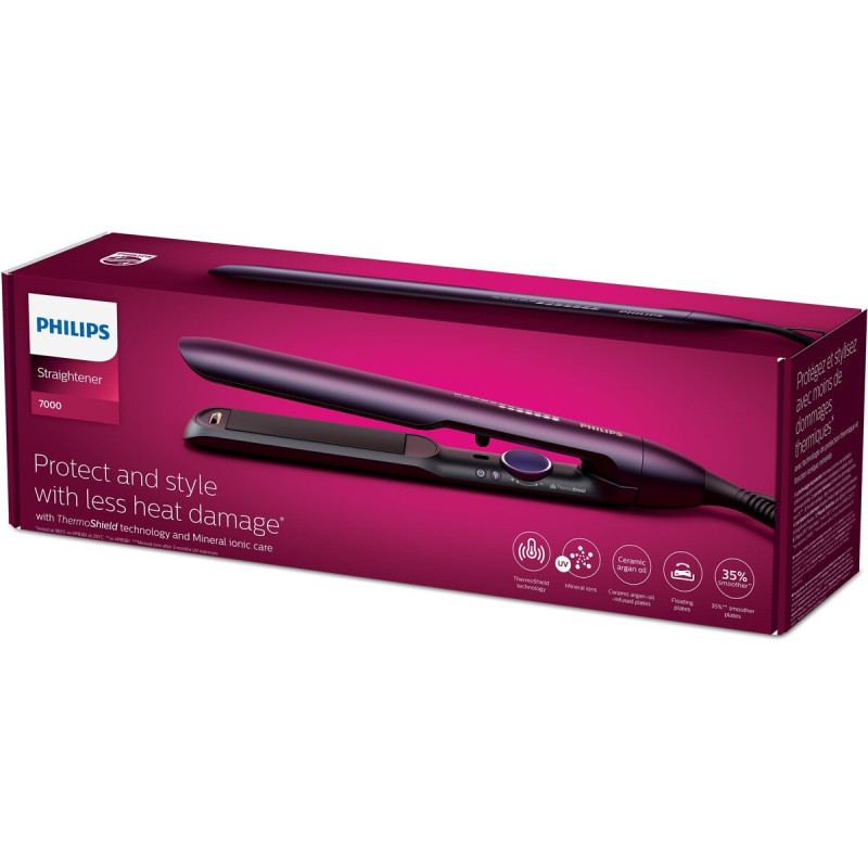 Захистіть та вкладайте волосся з технологією ThermoShield, що запобігає пошкодженню від перегрівання завдяки підтримці сталої оптимальної температури укладки. Мінеральні іони зменшують вплив ультрафіолету, а водні іони додатково зволожують волосся. Як результат - красиве, гладеньке та слухняне волосся, неперевершена укладка