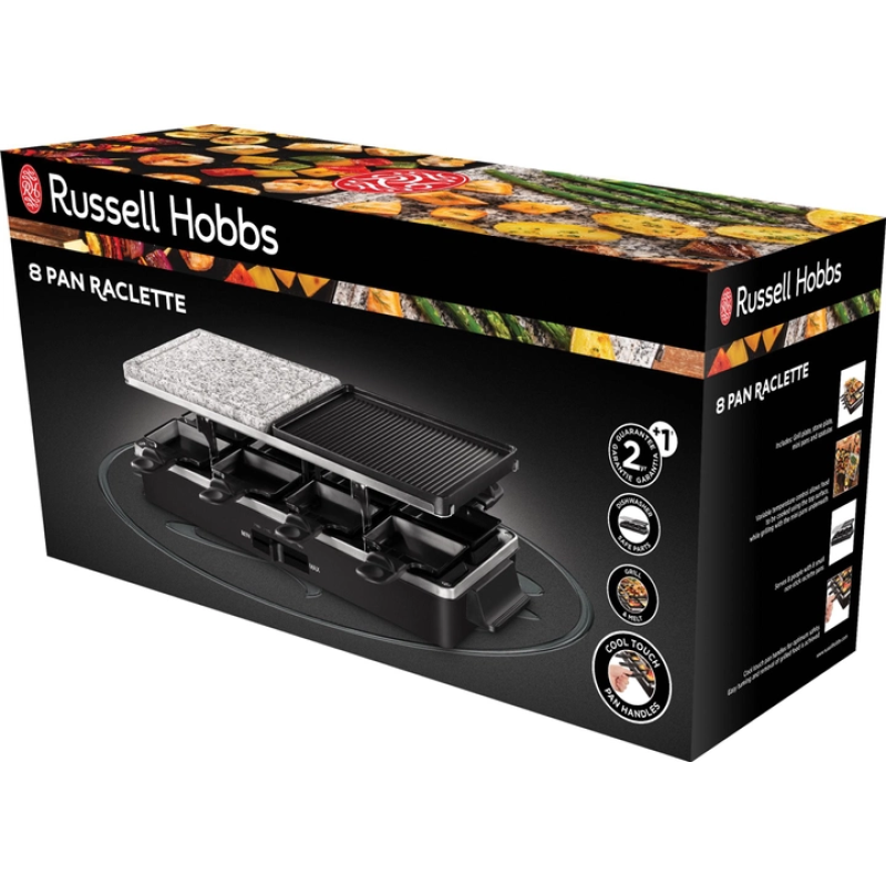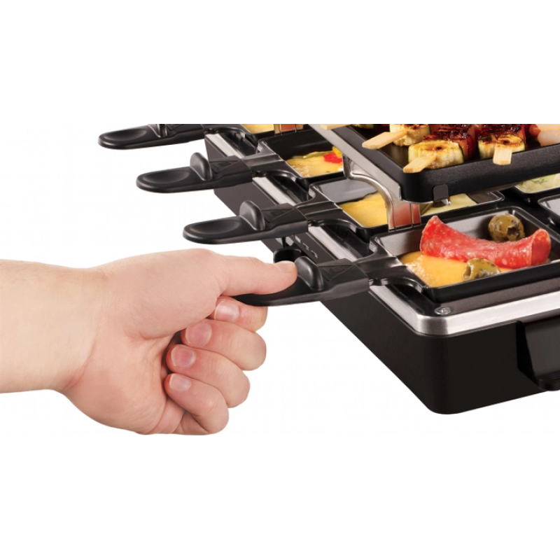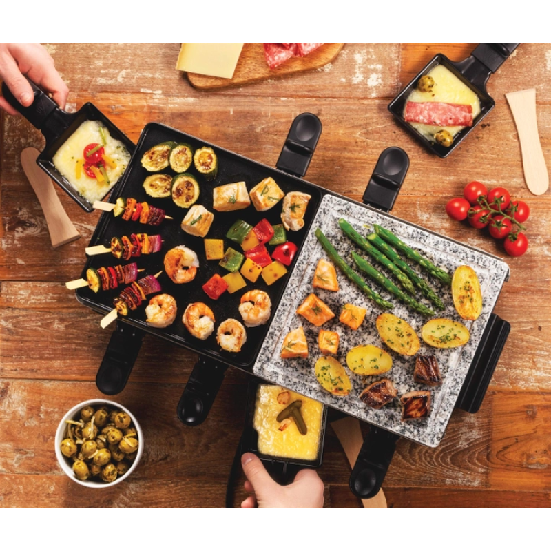 | Особливості | Двостороння антипригарна пластина Кам'яна плита для повільного просмажування Раклетниці з термоізольованими ручками Світловий індикатор роботи Пластини та раклетниці можна мити в посудомийній машині Порційні сковорідки - 8 шт |