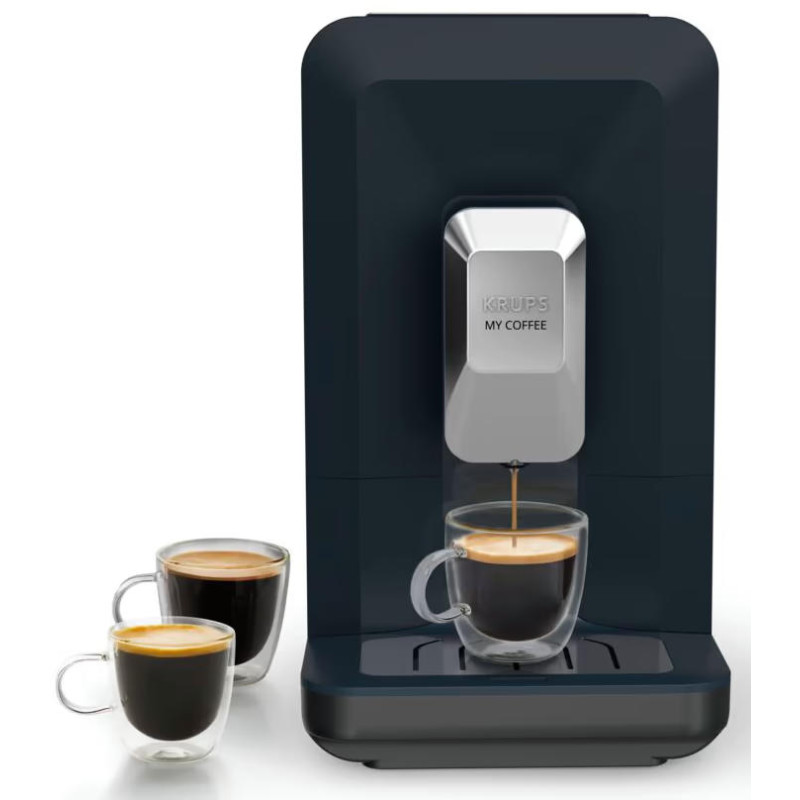Кавомашина Krups My Coffee працює з кавовими зернами та готує три автоматичні рецепти — еспресо, американо та фільтр-каву. Конічна металева кавомолка з п’ятьма рівнями регулювання помелу забезпечує точне налаштування для кожного напою. Сенсорна панель з OLED-дисплеєм відображає статус і дозволяє обрати міцність у трьох рівнях. Автоматичні програми очищення та виявлення накипу підтримують машину в робочому стані. Компактний металевий корпус чорного кольору займає мало місця на столі.