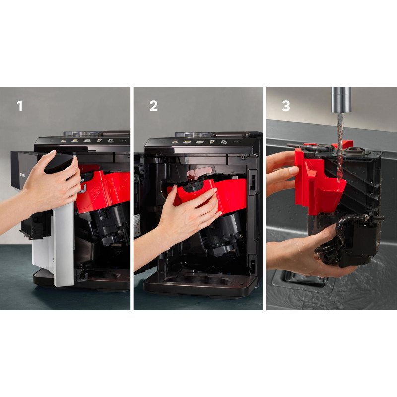 | Особливості | регулювання ступеня помелу/1-6 рівнів, деталі можна мити в посудомийній машині:/піддон для крапель, насадка для молока, трубка для молока, конт. для кавової гущі, знімний заварювальний блок, система calc'nClean/автоматично очищає та видаляє накип, кераміч |