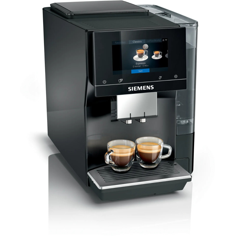 Кавомашина Siemens TP713R09 з інноваційним 5" сенсорним дисплеєм iSelect Display, підтримкою до 36 напоїв (включаючи ColdBrew), aromaSelect, автоматичним очищенням парою autoMilk Clean та керуванням через додаток Home Connect. Оснащена керамічним млинком, потужним насосом (19 бар) і зручним функціоналом для приготування двох чашок одночасно.