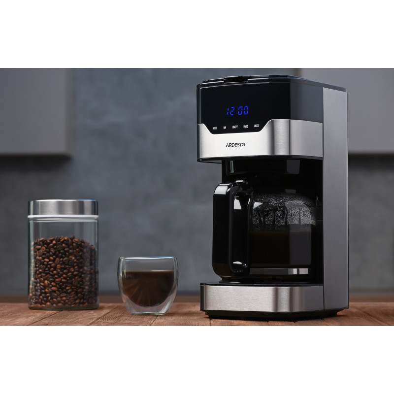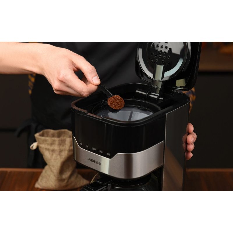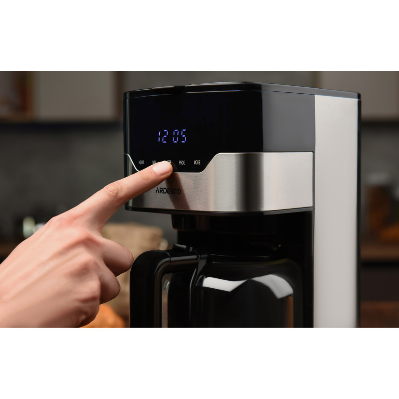 Крапельна кавоварка для меленої кави з потужністю 900 Вт, таймером приготування, підігрівом кавника та вибором міцності напою. Кавоварка FCM-D3100 оснащена сенсорним блоком управління з дисплеєм, знімним багаторазовим фільтром і підтримує приготування чаю.