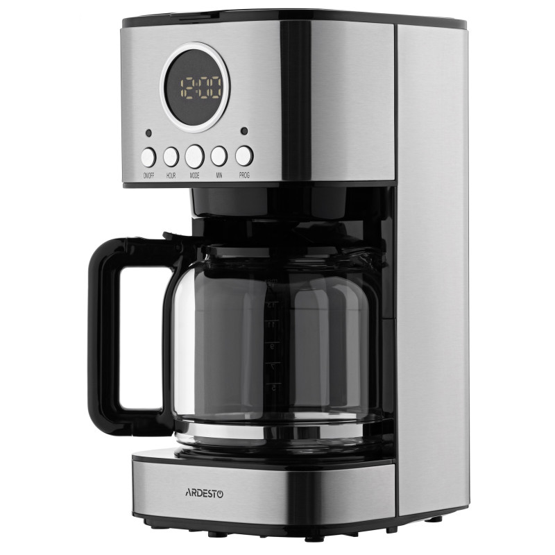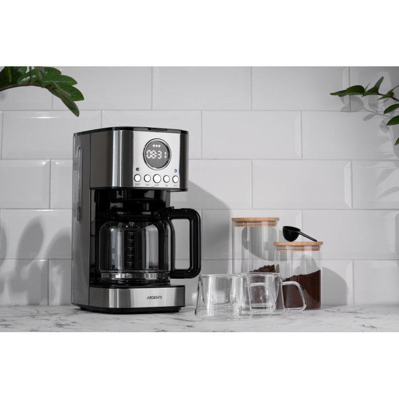 Крапельна кавоварка Ardesto Ardesto FCM-D3200. Крапельна кавоварка потужністю 900 Вт для використання в побутових та аналогічних побутовим умовах: магазинах, офісах, готелях тощо. Кавник об’ємом 1,5 л виготовлено зі стійкого до високих і низьких температур боросилікатного скла. Пристрій має зручне керування, оснащений стильним дисплеєм із білим підсвічуванням, знімним фільтром, що можна мити, та антикрапельною системою.
