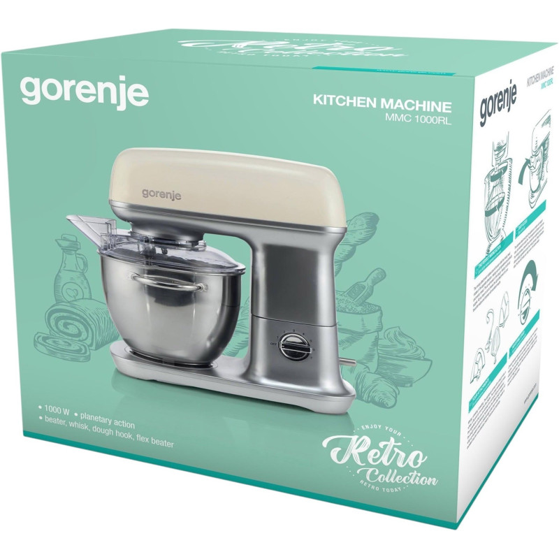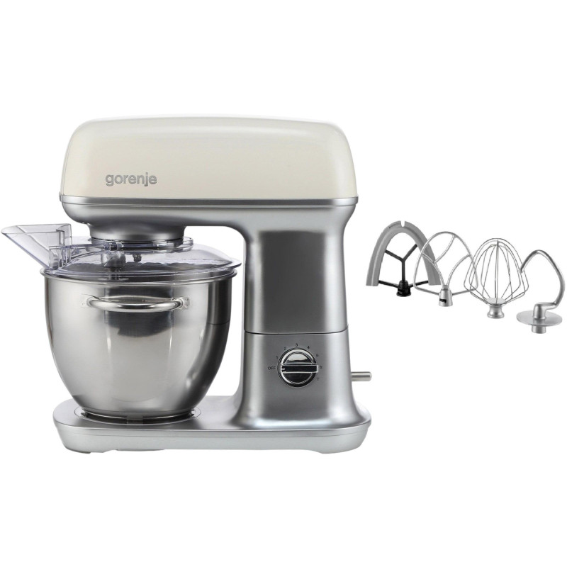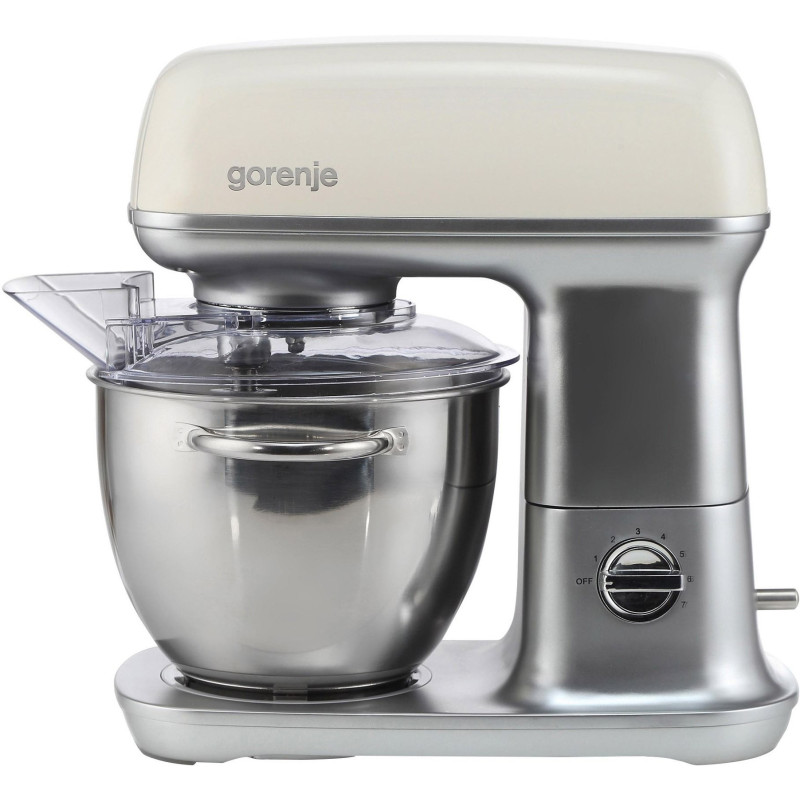 Кухонна машина Gorenje потужністю 1000 Вт оснащена металевим корпусом і чашею об'ємом 4,5 л з ручкою. Завдяки 3D-змішуванню та 7 швидкостям із плавним запуском забезпечує рівномірне змішування. У комплекті 4 насадки: гак для тіста, віничок, лопатка й силіконова насадка. Має захист від перегріву, кришку з отвором для інгредієнтів і стабільні гумові ніжки.