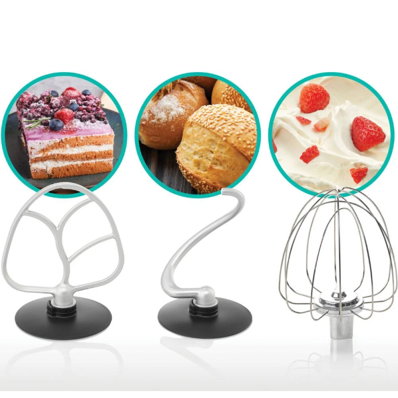| Комплектація | Кухонна машина, гак для замісу тіста, лопатка для змішування, віночок для збивання, 2 диски для нарізки скибочками та шатківниці, 1 ніж, м'ясорубка, 2 диски для фаршу, інструкція, гарантія |