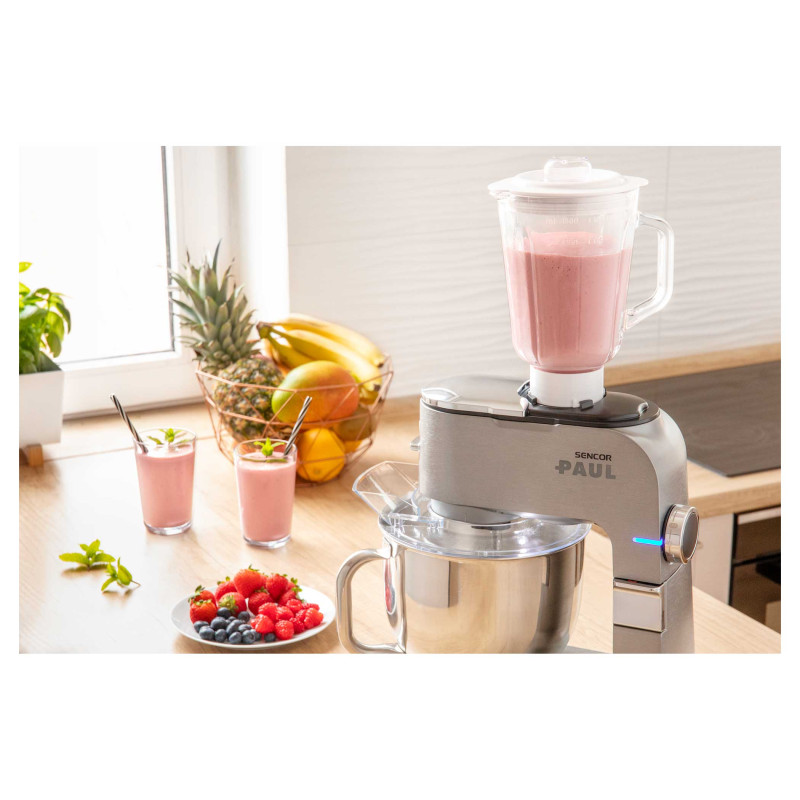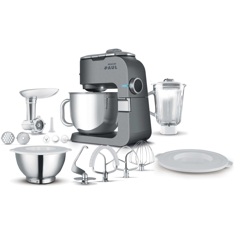 Кухонна машина Sencor Paul 1 STM7950 (1700 Вт) з металевим корпусом, двома нержавіючими чашами (3,5 і 6,5 л), м’ясорубкою, блендером 1,5 л, насадками для тіста, збивання, м’яса та ковбас. Потужність, функціональність і стиль для вашої кухні.