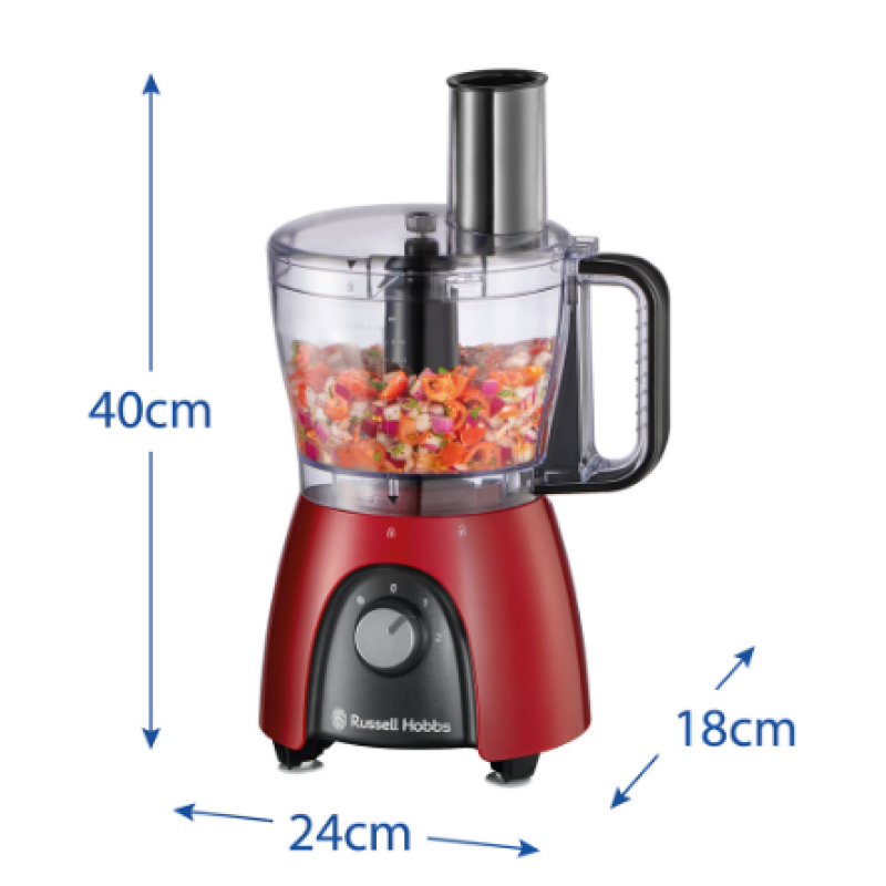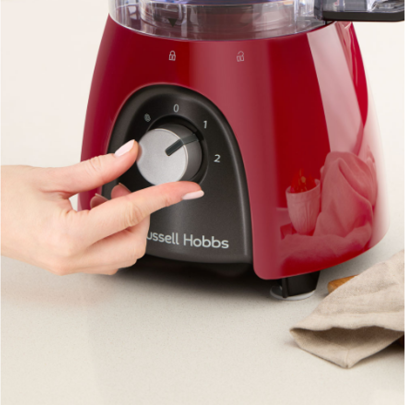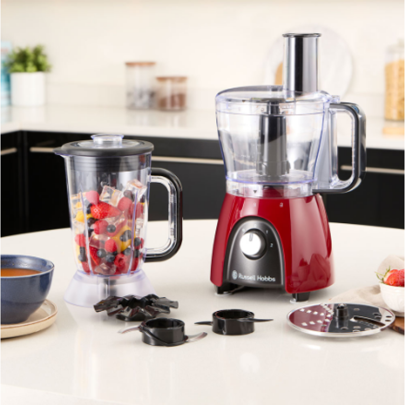Якщо вам потрібен універсальний, швидкий і ефективний прилад для приготування їжі, зверніть увагу на кухонний комбайн Russell Hobbs Desire Red. Потужність 600 Вт (пікова потужність 900 Вт*), чаша на 2,3 л і глечик на 1,5 л - цього достатньо, щоб запросити друзів на смачний перекус. Ідеальне доповнення до будь-якої зайнятої кухні, він має чотири зручні насадки, 2 швидкості й імпульсний режим для додаткового контролю. Він впорається з будь-яким завданням з нарізання, змішування або блендування, і у вас залишиться час, щоб вдосконалити свій улюблений рецепт до того, як ви зголоднієте! Завдяки знімним деталям, які можна мити в посудомийній машині, після завершення роботи ви можете закинути все в посудомийну машину або раковину.