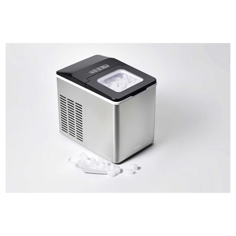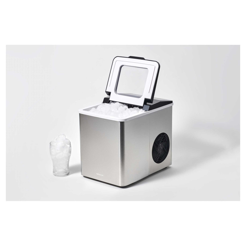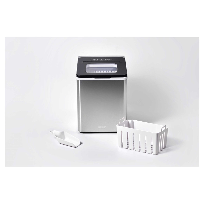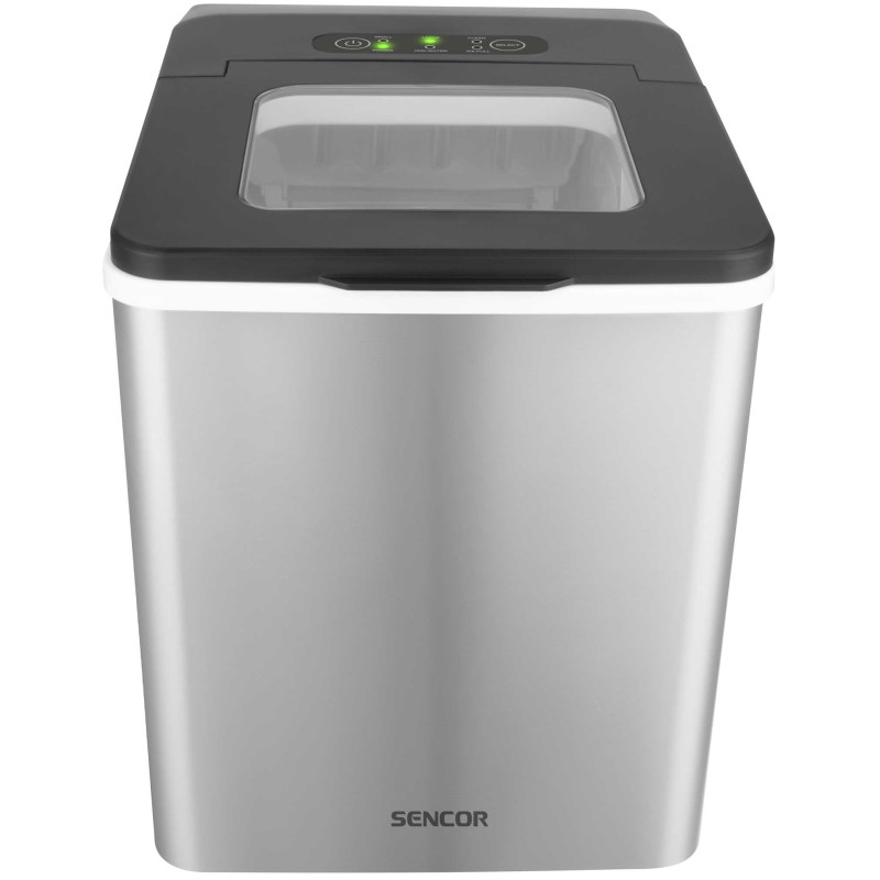Компактний льодогенератор Sencor із корпусом з нержавіючої сталі виробляє до 12 кг льоду на добу. Готує 9 кулькових кубиків за 7–15 хвилин, має два розміри льоду, автоматичну зупинку, прозору кришку та зливний клапан. Ідеальний для дому та вечірок.