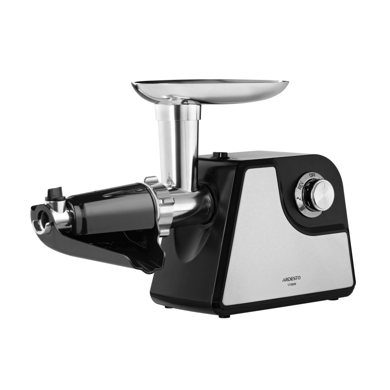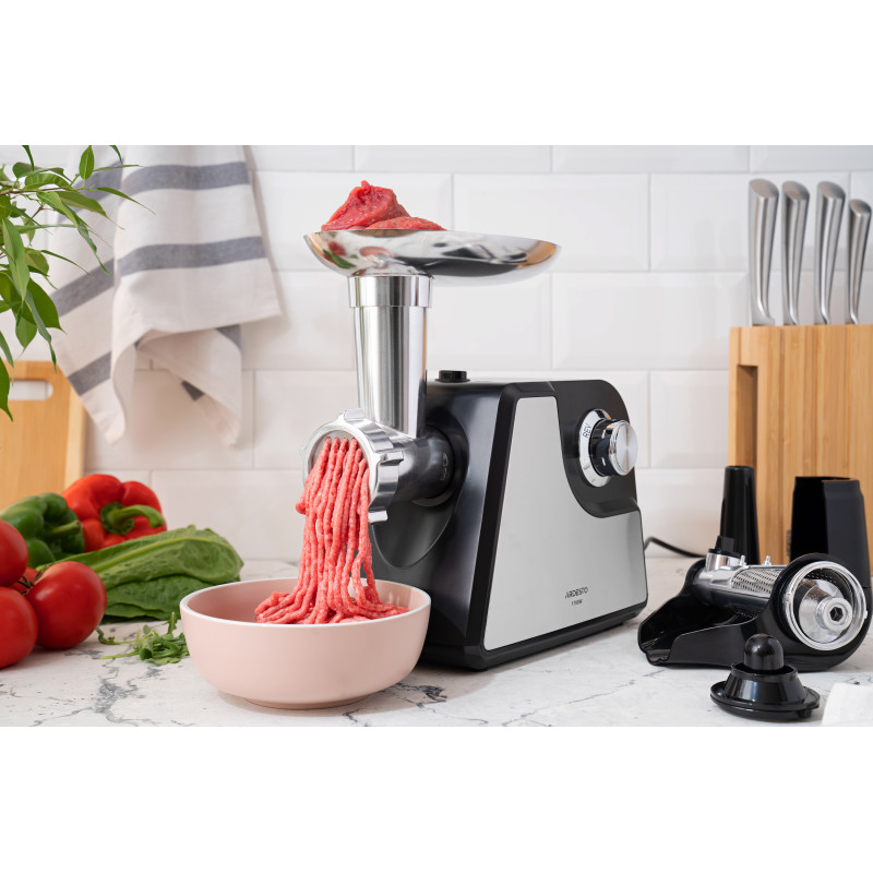 М’ясорубка з потужністю 1700 Вт, змінними насадками для приготування фаршу, домашніх ковбасок та кеббе, а також насадкою для віджиму томатного соку.