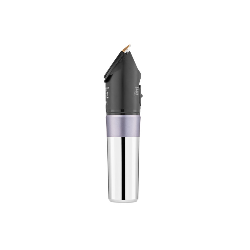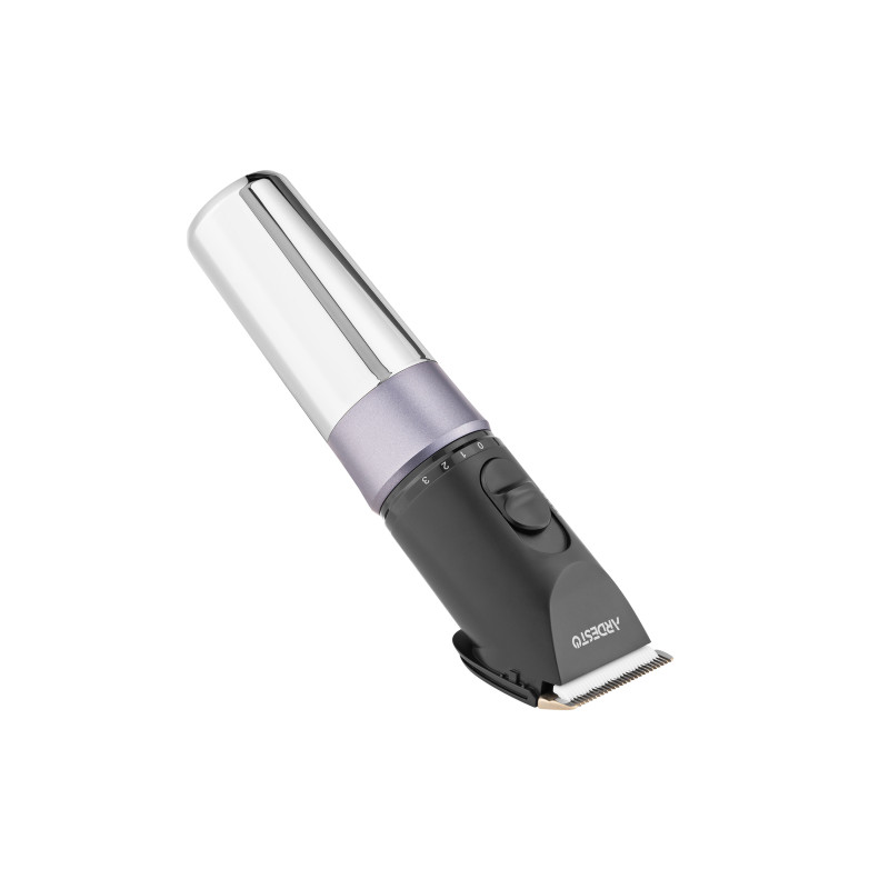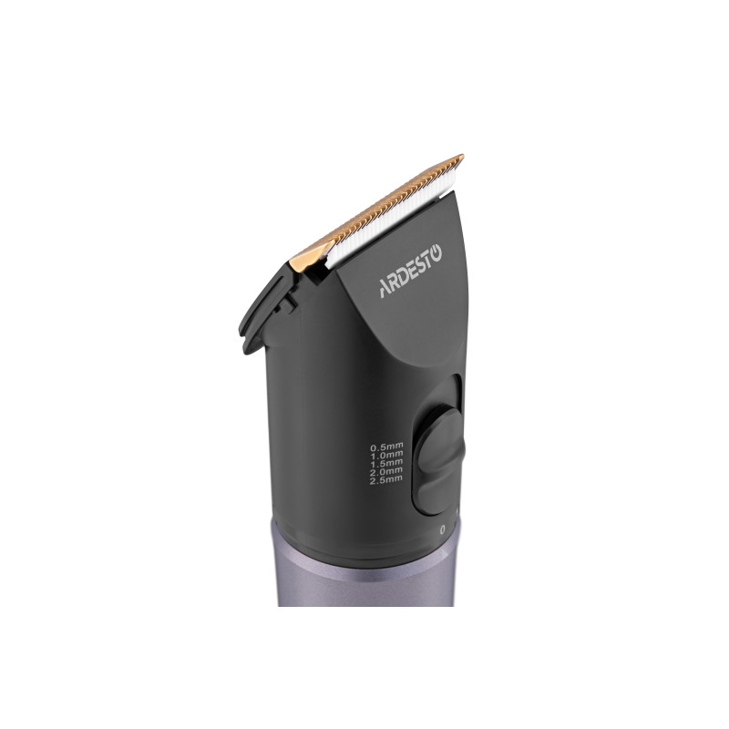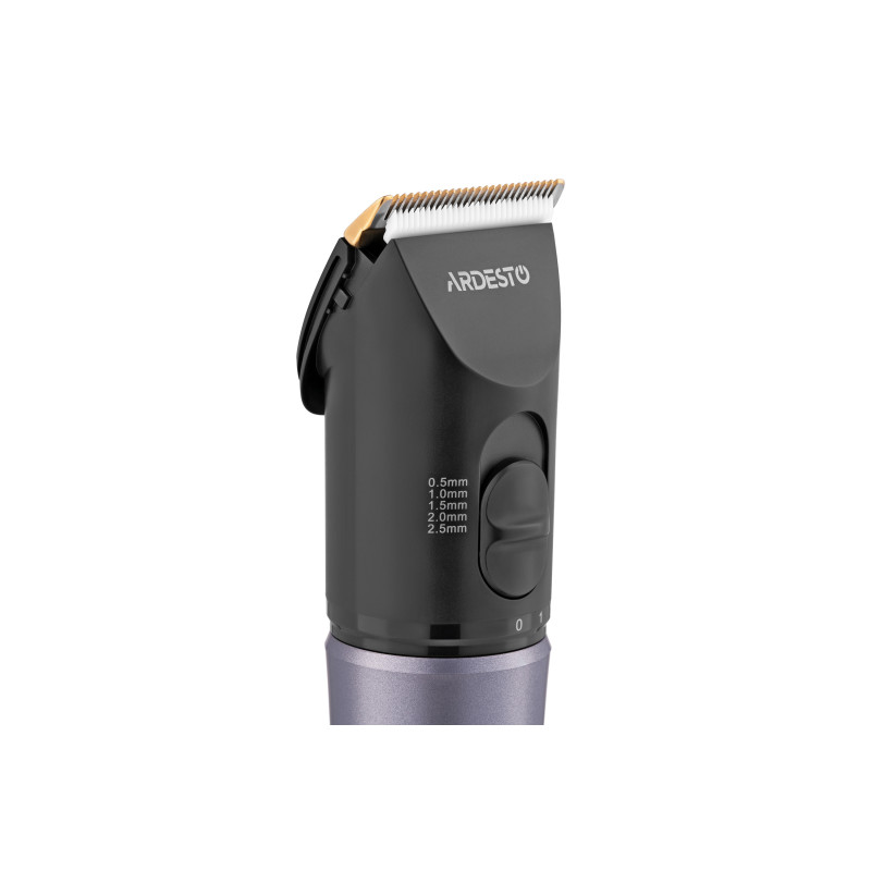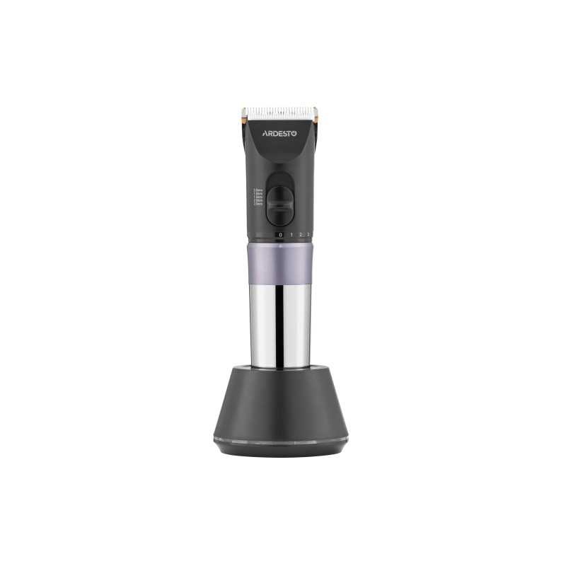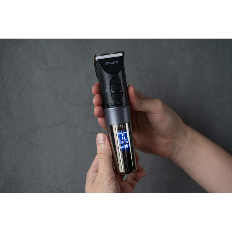 Компактна машинка для підстригання волосся з керамічним лезом, вбудованим акумулятором, LED-дисплеєм та комплектом насадок. Корпус виконано з пластику чорного кольору та доповнено хромованою ручкою. Машинка підтримує регулювання довжини підстригання без використання насадок, а для зручного зберігання передбачена підставка з можливістю підзарядки.