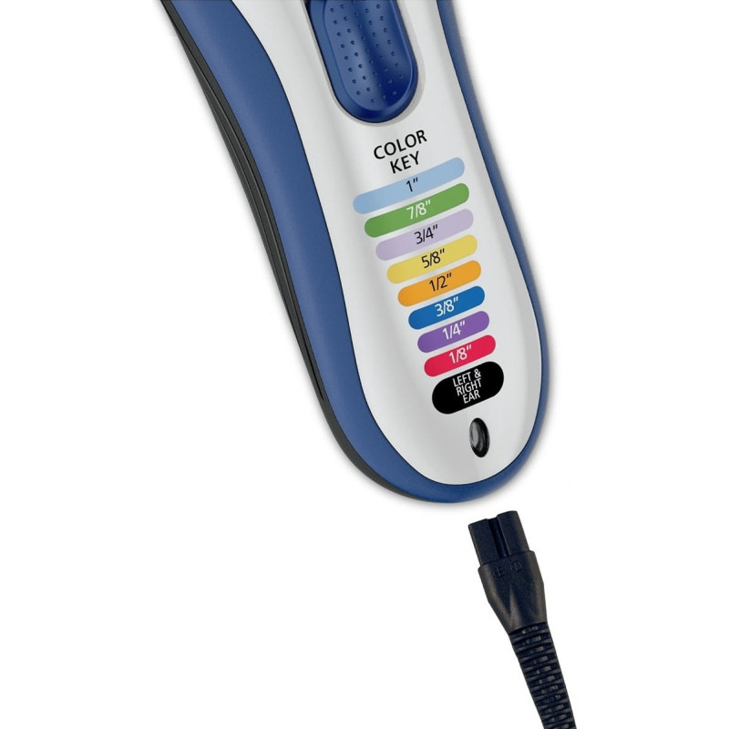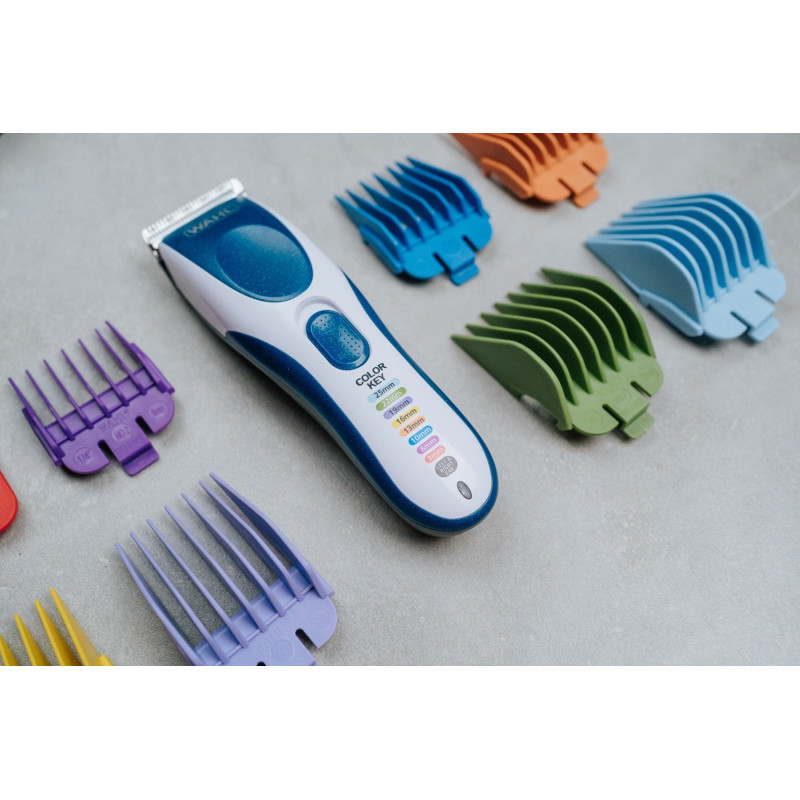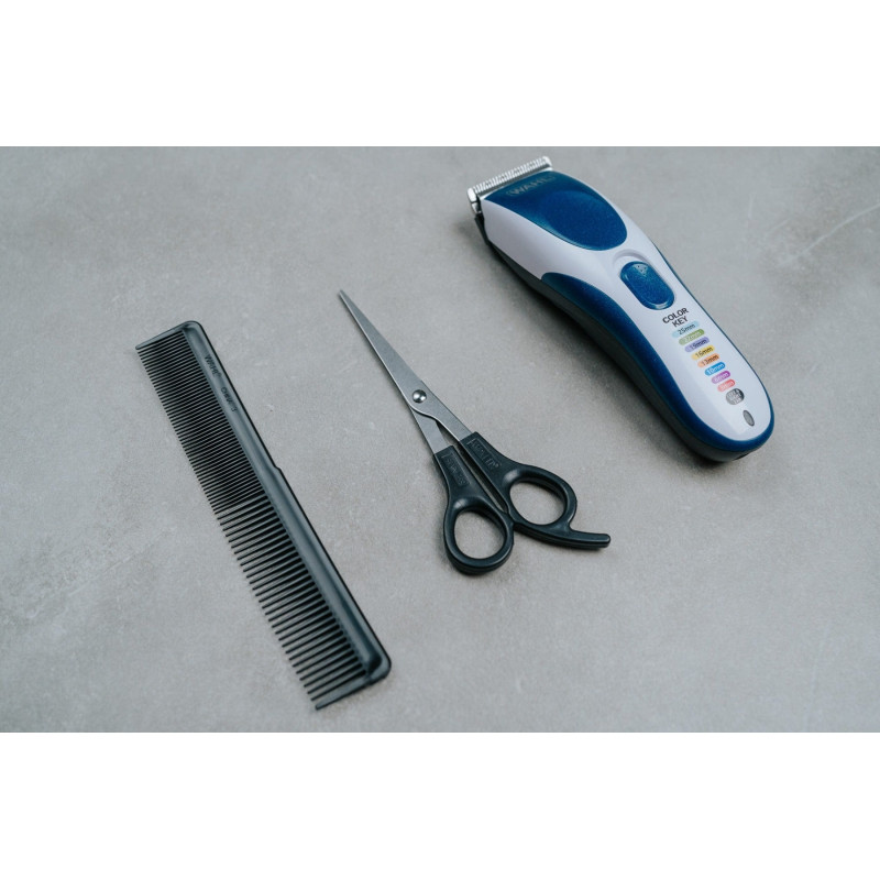 Набір для стрижки волосся WAHL Color Pro Cordless поєднує в собі зручність бездротової роботи та високу точність завдяки міцним сталевим лезам. Оснащений як акумулятором, так і можливістю роботи від мережі, він забезпечує до 60 хвилин автономної роботи, що робить його ідеальним для домашнього та професійного використання. Головною особливістю є кольорові насадки-гребінці, які спрощують вибір потрібної довжини. Комплект включає ножиці, гребінець і спеціальний футляр для зручного зберігання. Стильний синій дизайн додає приладу естетичної привабливості.