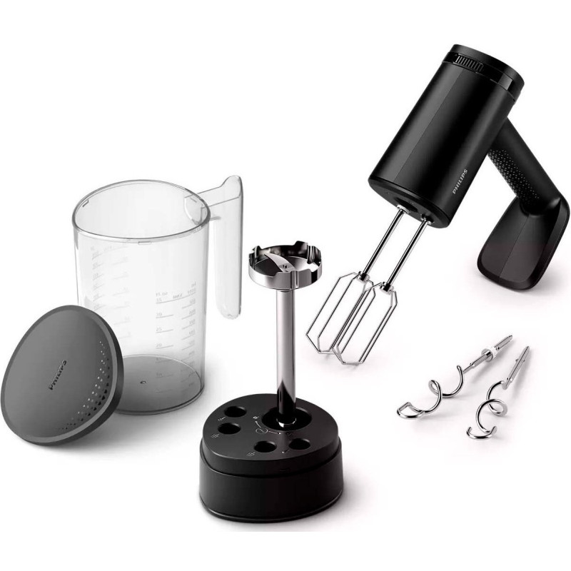 Потужний і універсальний кухонний ручний міксер «2-в-1». Цей ручний міксер «2-в-1» змішує або замішує навіть жорстке тісто за лічені хвилини. З ним можна досягати кожного куточка глибоких чаш, мінімізувати бризки й зменшити час очищення завдяки конструкції подовженої форми та функції плавного запуску Soft Start. З насадкою для блендера та чашею для зберігання.