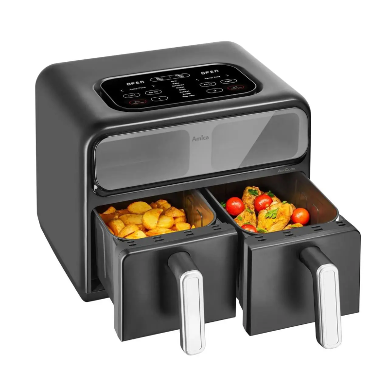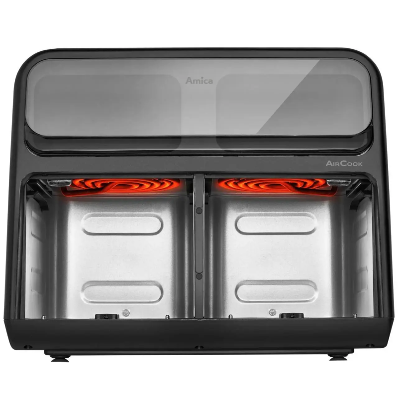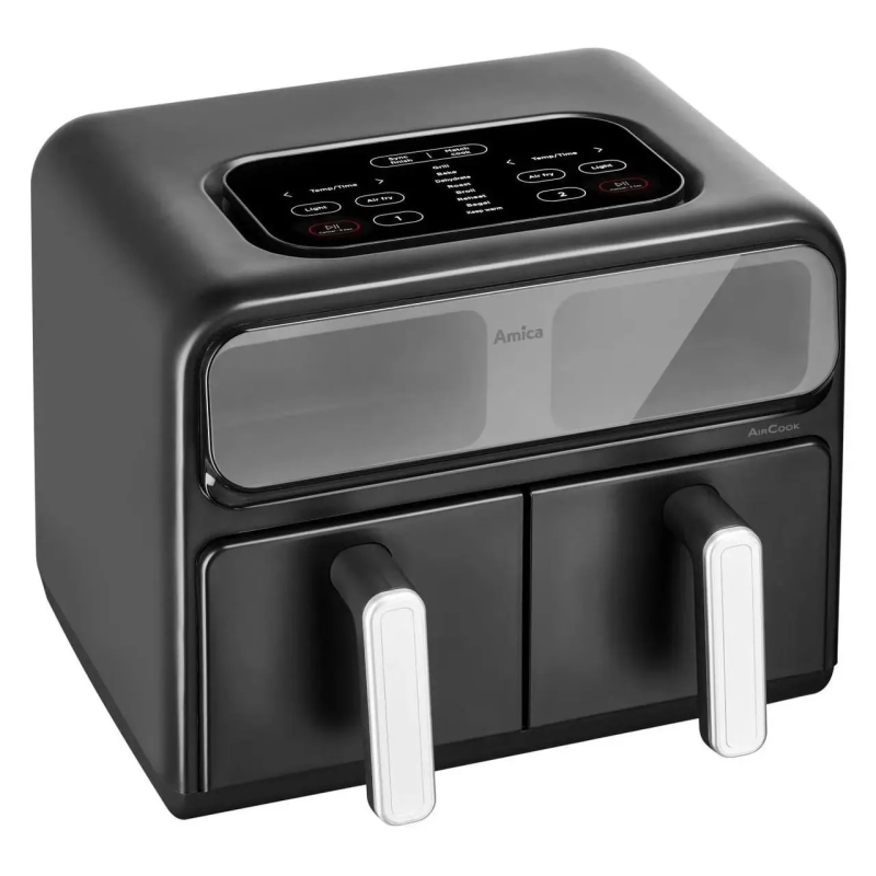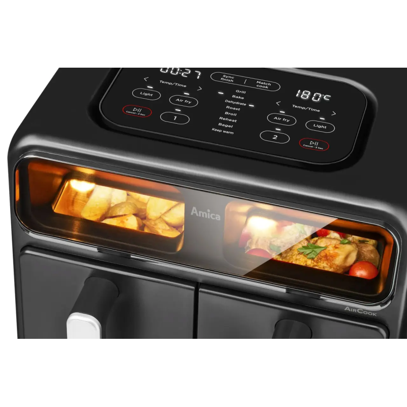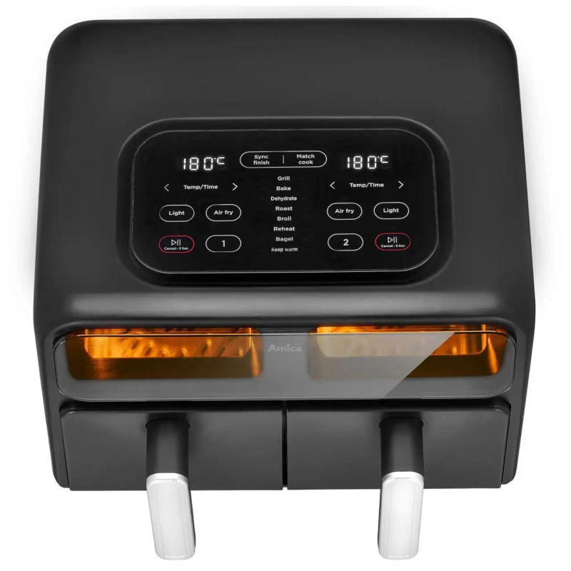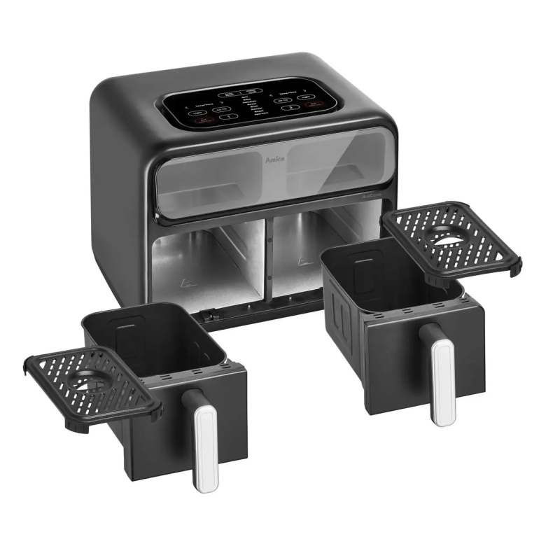 Мультипіч Amica AFM7020 — це аерофритюрниця з двома камерами для одночасного приготування різних страв. Загальна потужність 2400 Вт та об’єм чаш 2×4,0 л підходять для щоденного використання. Сенсорне керування та 8 автоматичних програм спрощують процес приготування. Антипригарне покриття та підсвічування внутрішньої камери підвищують зручність експлуатації. Корпус виконаний із пластику чорного кольору.