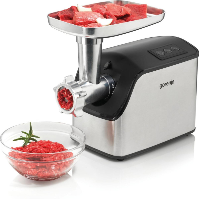 М’ясорубка Gorenje призначена для подрібнення м’яса та приготування фаршу різної структури. Максимальна потужність двигуна становить 2200 Вт, передбачені реверс і металевий механізм подрібнення. Конструкція доповнена металевим лотком для продуктів і системами безпеки, що включають захист від перегріву та миттєву зупинку двигуна. У комплекті є два диски 3 мм і 7 мм, а також насадка для ковбас.