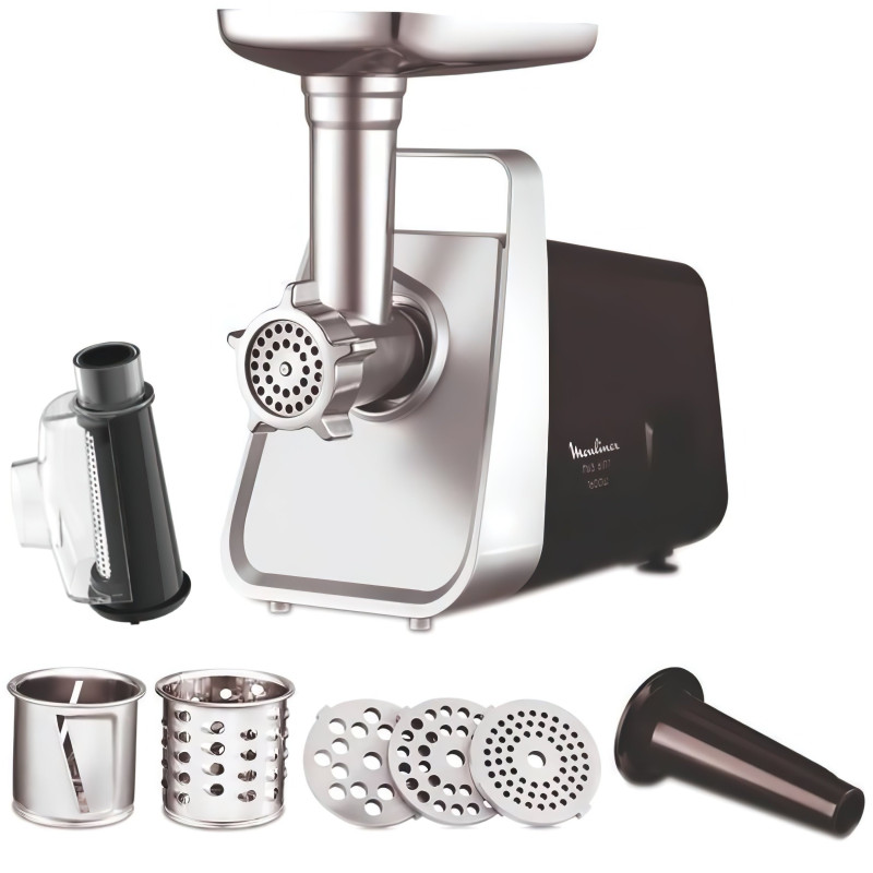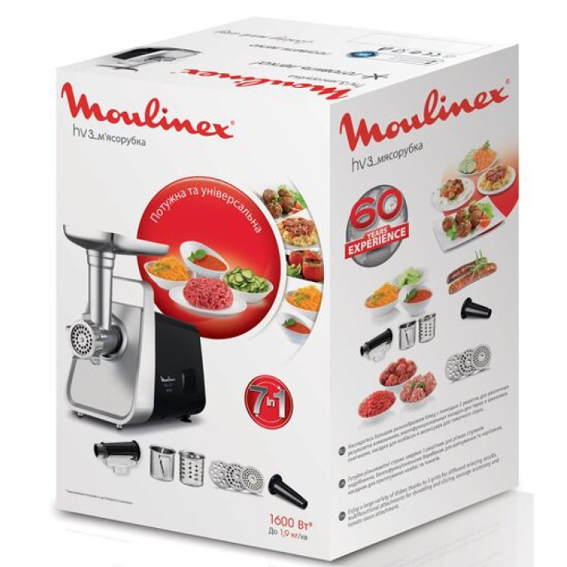 М'ясорубка з високою потужністю 1600 Вт та продуктивністю до 1,9 кг в хвилину швидко подрібнить навіть тверде м'ясо. Насолоджуйтеся різноманітністю різних рецептів, які можна легко приготувати завдяки універсальності пристрою: 3 різні решітки для м'яса (для дрібного, середнього, грубого подрібнення), насадка для томатів і ягід, 2 барабана для терки/шинкування, насадка для ковбас.