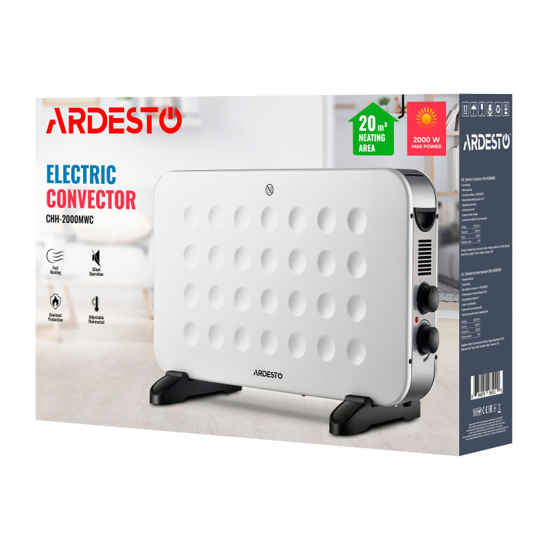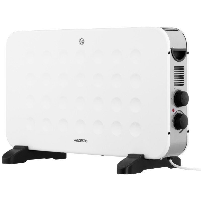 Електричний конвектор із механічним керуванням білого кольору зі стильним візерунком, класом захисту IP20 і двома режимами потужності 1 250/2 000 Вт. Оснащений регульованим термостатом і розрахований на обігрів приміщення площею 20 м2 . Клас енергозахисту – перший. Є захист від перегріву та індикатор живлення нагрівального елемента. Конвектори ARDESTO підтримують два типи монтажу – настінний і підлоговий. Кронштейни та пасивні опори для підлогового встановлення